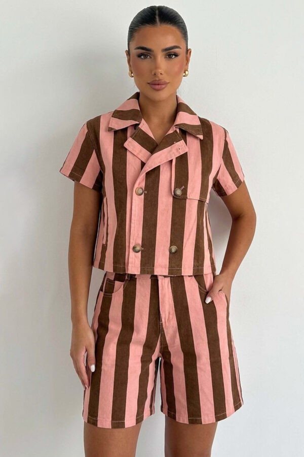Σετ ριγέ σακάκι over size με πέτο και βάτες και ψηλόμεσο παντελόνι σε ίσια γραμμή. Κλείνει με φερμουάρ και κουμπί. Κορυφαία casual χριστουγεννιάτικα looks για κάθε εορταστική περίσταση από το πρωί μέχρι το βράδυ. Μήκος Σακάκι 77cm Στήθος 48cm Μανίκι 62cm Μήκος Παντελόνι 106cm Μέση 33cm