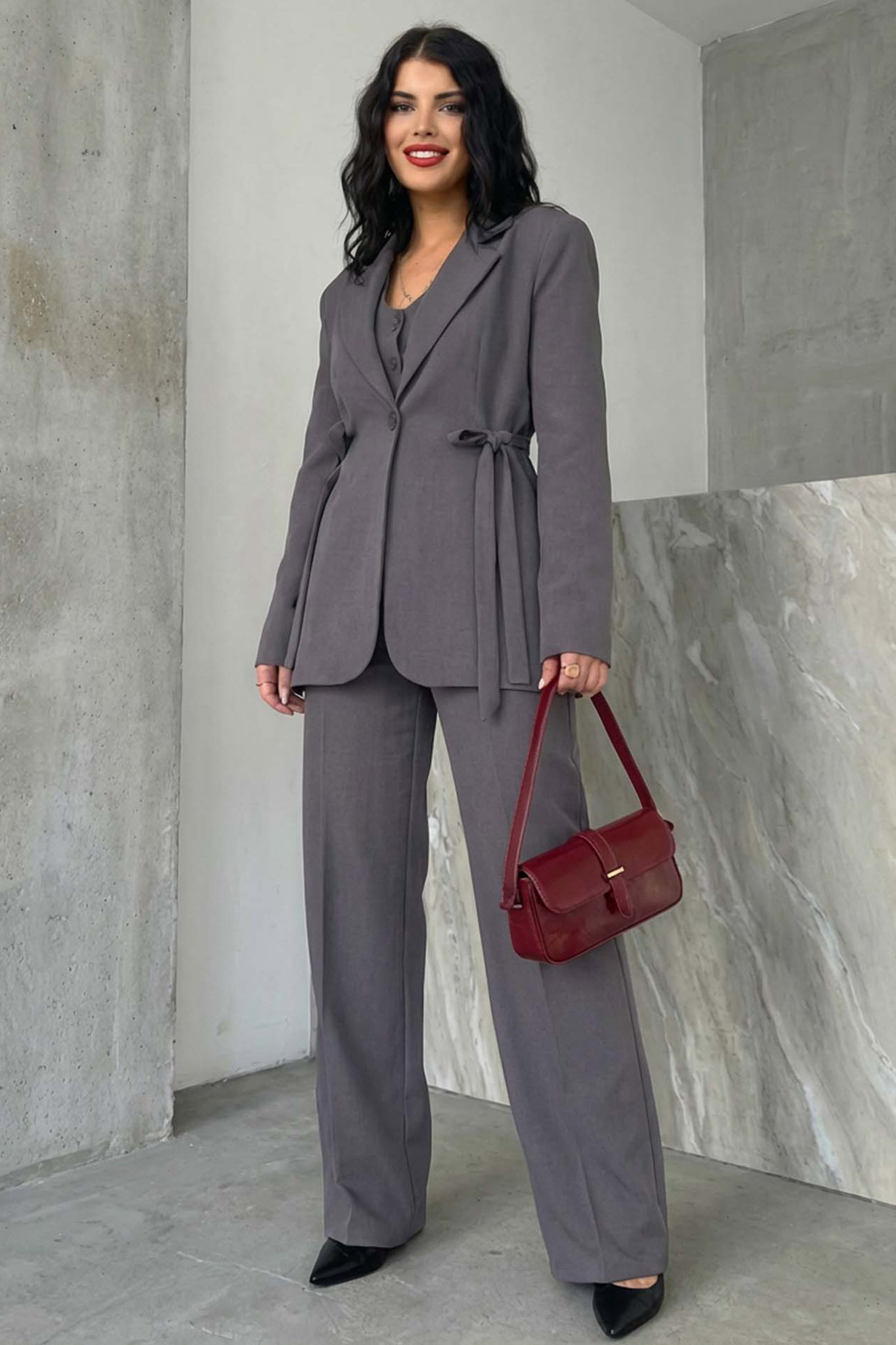 Ολοκληρωμένο σετ που αποπνέει κομψότητα και δυναμισμό. Ιδανικό για office looks και επίσημες εμφανίσεις. Μεσάτο, με πέτο και διακοσμητική ζώνη που δένει στη μέση και παντελόνι σε ίσια γραμμή με τσάκιση που κολακεύει κάθε σωματότυπο.
