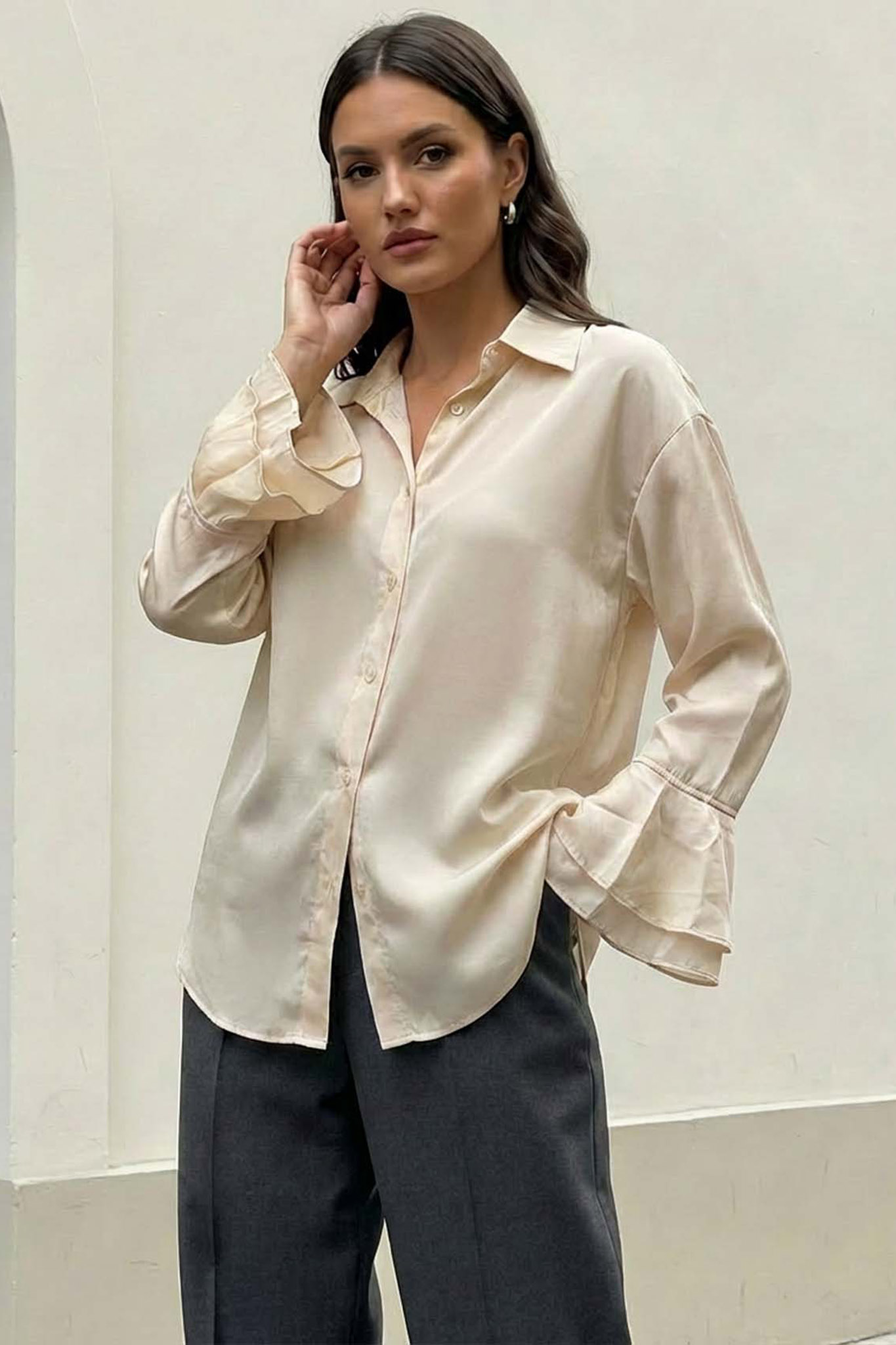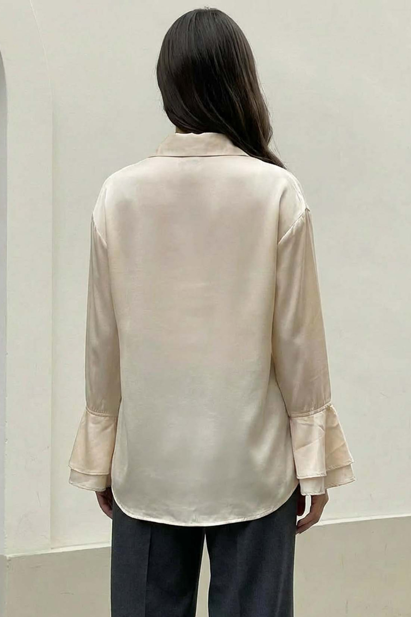Πουκάμισο σε ίσια γραμμή με βολάν στο τελείωμα των μανικιών. Mήκος 67cm, στήθος 106cm, μανίκι 53cm