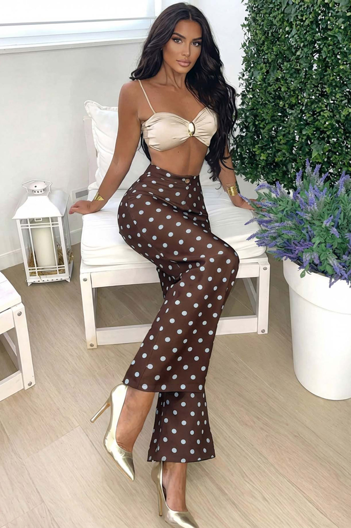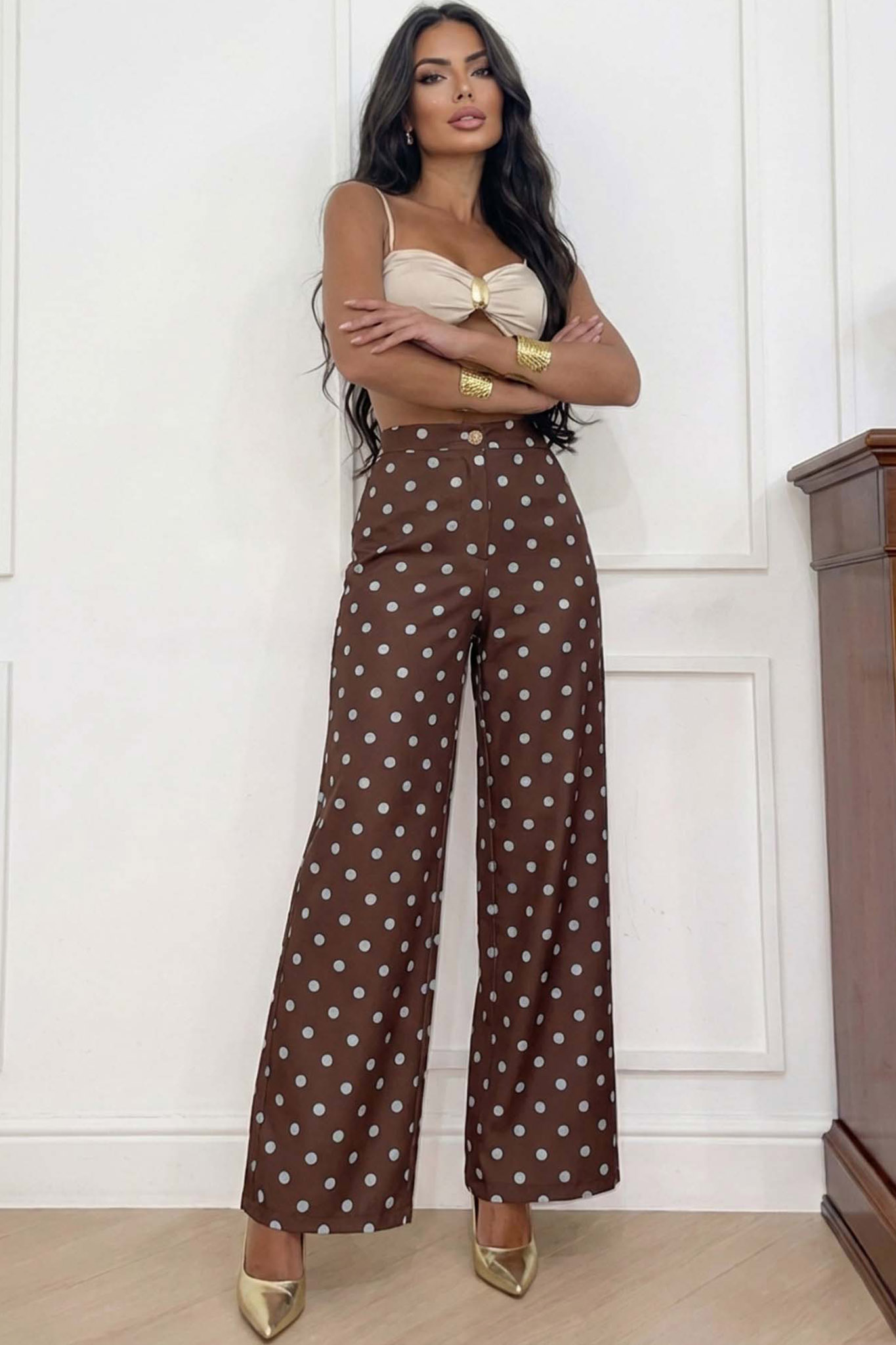 Ψηλόμεση παντελόνα πουά με πιέτες. Ιδανικό για να φορεθεί από το πρωί έως το βράδυ.
