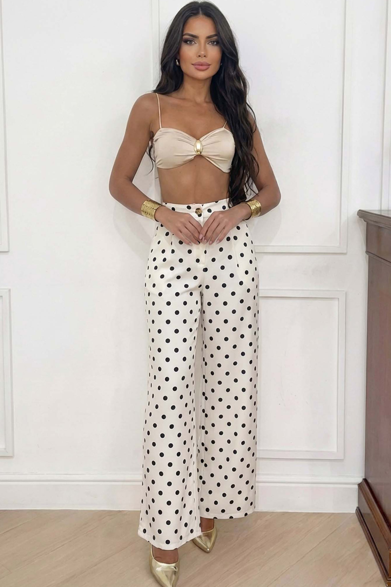 Ψηλόμεση παντελόνα πουά με πιέτες. Ιδανικό για να φορεθεί από το πρωί έως το βράδυ.