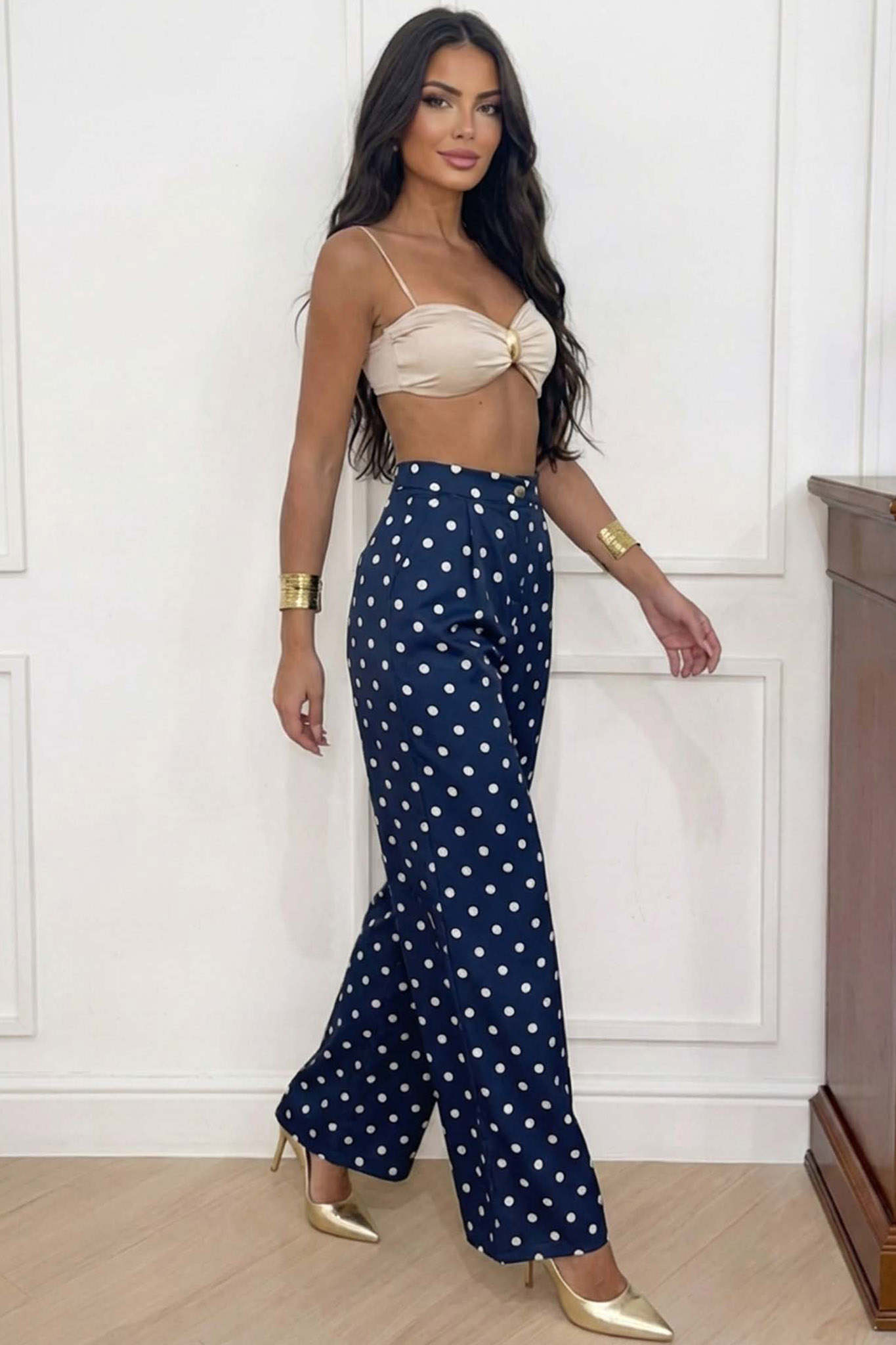 Ψηλόμεση παντελόνα πουά με πιέτες. Ιδανικό για να φορεθεί από το πρωί έως το βράδυ.