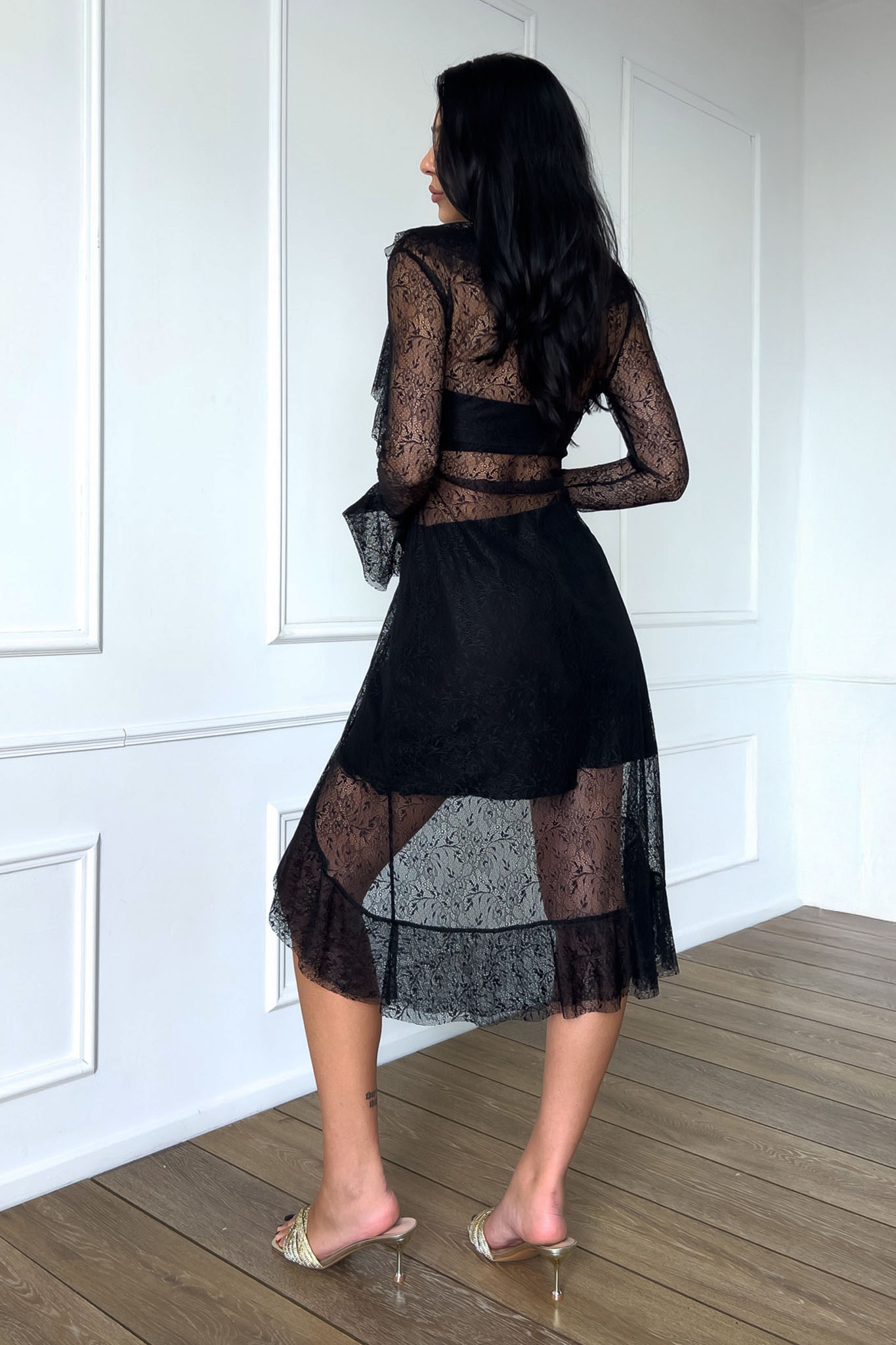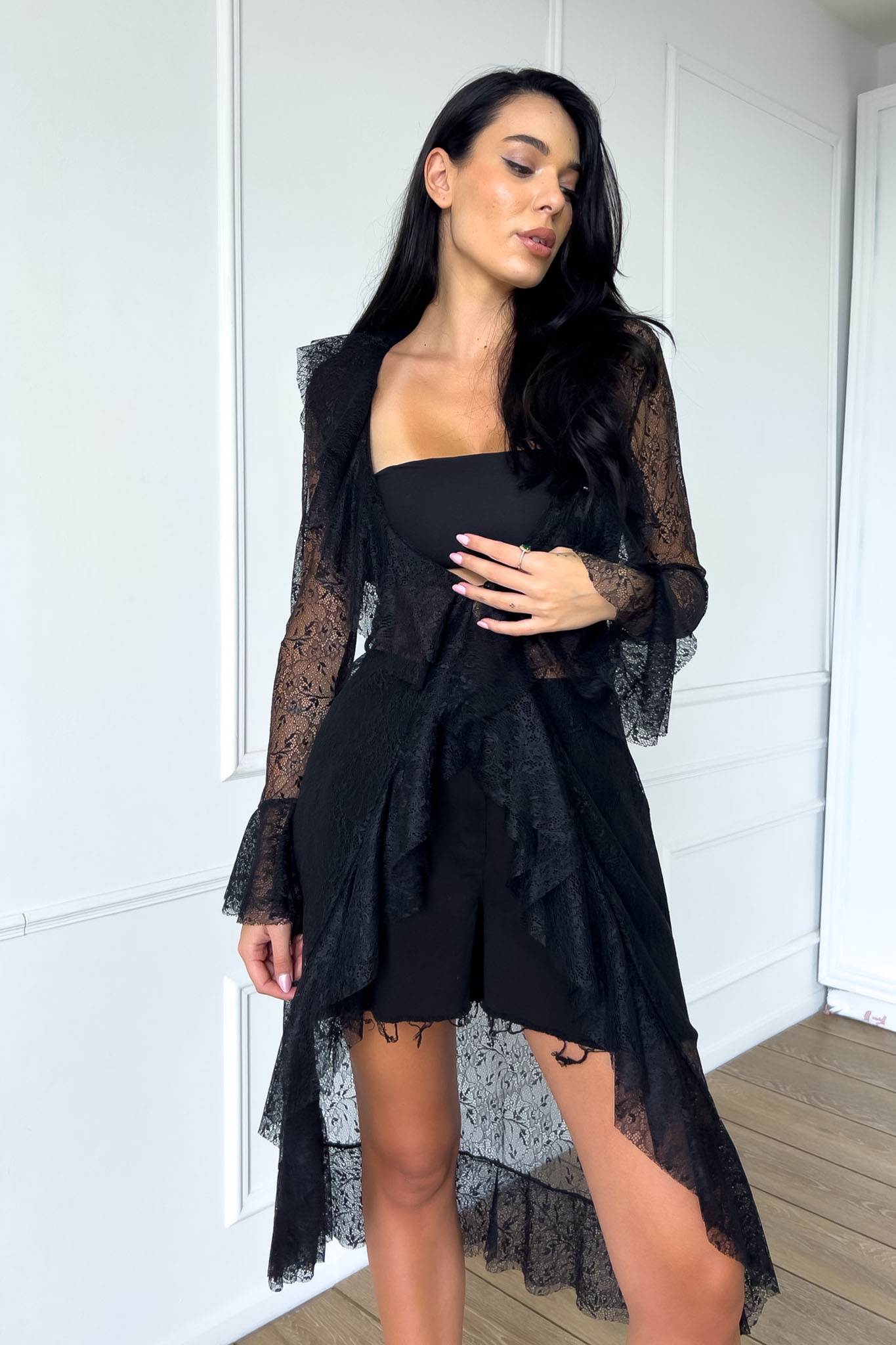 Αυτό το κομψό και αέρινο κιμονό είναι κατασκευασμένο από διαφανή δαντέλα, προσφέροντας μια ρομαντική και bohemian αισθητική.Διαθέτει βαθύ V-λαιμόκοψη και εντυπωσιακά βολάν κατά μήκος της λαιμόκοψης και του ανοίγματος μπροστά, προσθέτοντας κίνηση και θηλυκότητα.Τα μακριά μανίκια καταλήγουν σε φαρδιές καμπάνες με βολάν, ενισχύοντας τον αέρινο χαρακτήρα του ενδύματος.Η διαφάνεια της δαντέλας επιτρέπει να φορεθεί πάνω από τοπ ή φορέματα, δημιουργώντας ενδιαφέρουσες υφές και στρώσεις.