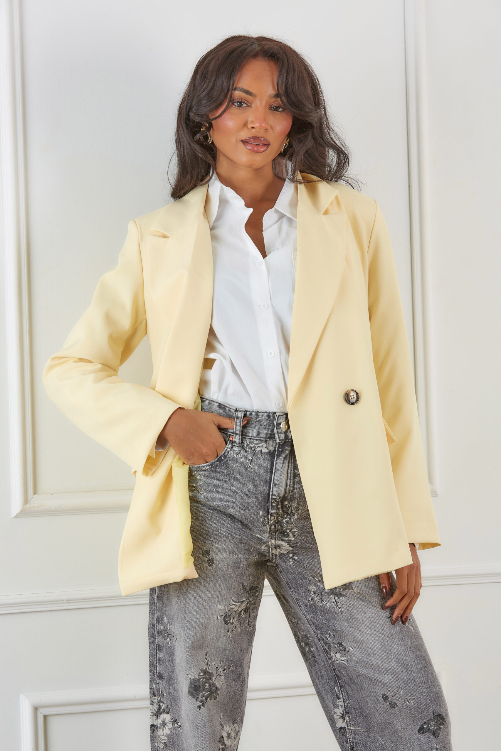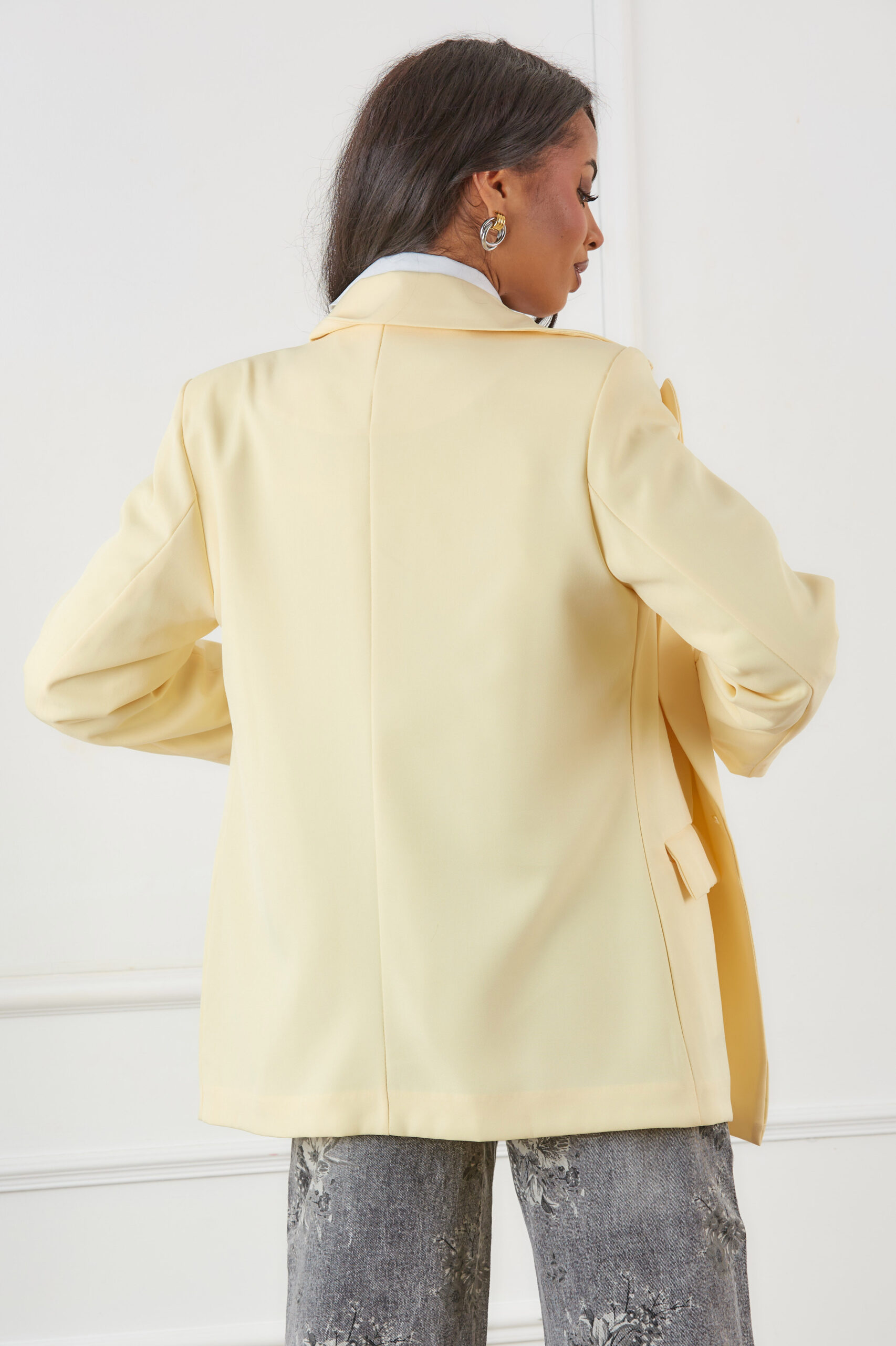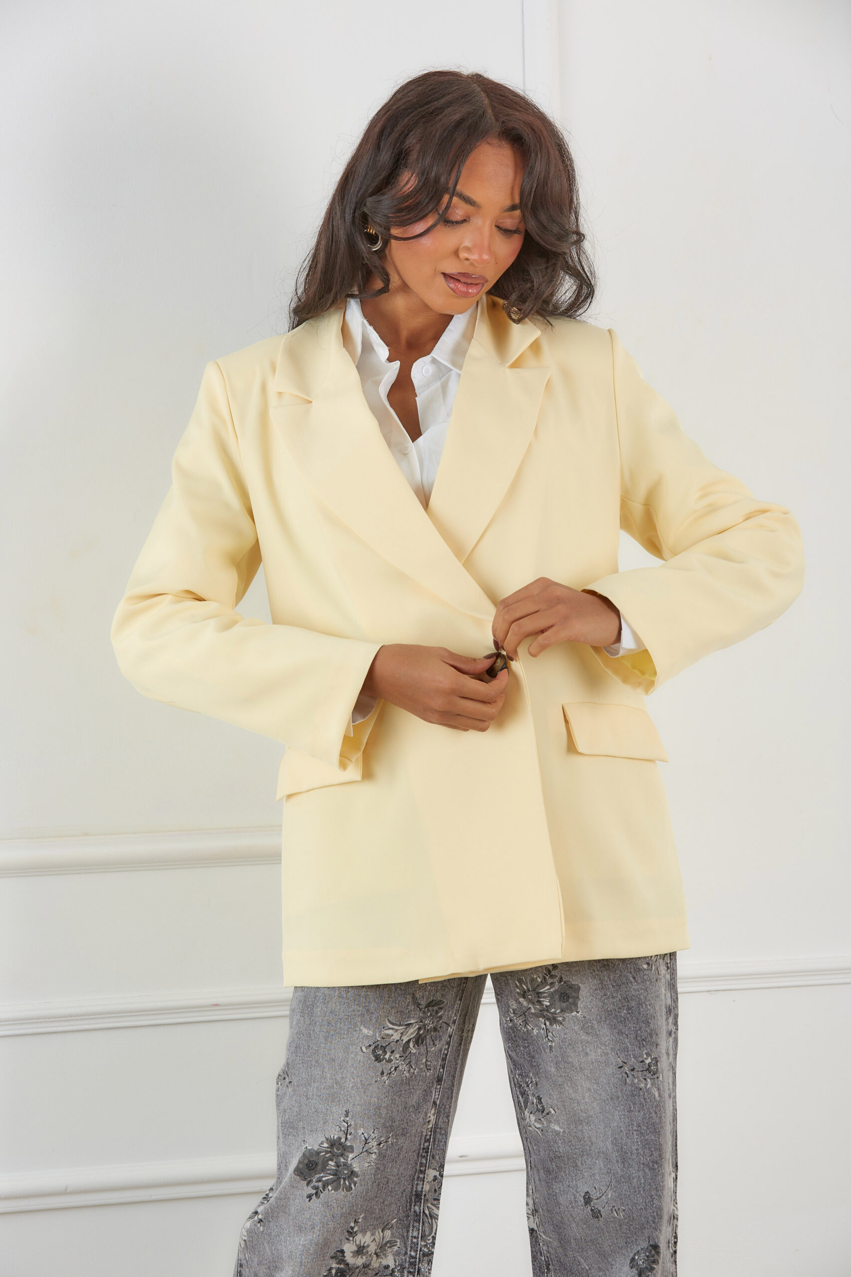 Σακάκι με βάτες και κουμπί. Διαθέτει διακοσμητικές τσέπες. Ιδανικό για εμφανίσεις από το πρωί έως το βράδυ.