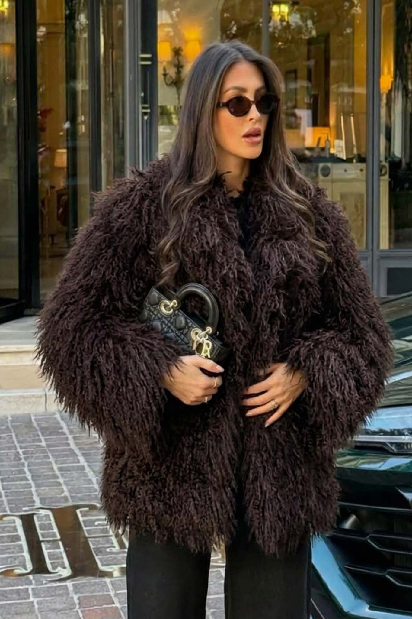 Αναβαθμίστε το στυλ σας με αυτό το εντυπωσιακό, shaggy παλτό από οικολογική γούνα. Η πλούσια υφή και το ζεστό σοκολατί καφέ χρώμα προσθέτουν μια πινελιά πολυτέλειας και άνεσης στην εμφάνισή σας. Ιδανικό για τις κρύες μέρες, αυτό το παλτό είναι ένα statement κομμάτι που τραβάει τα βλέμματα.