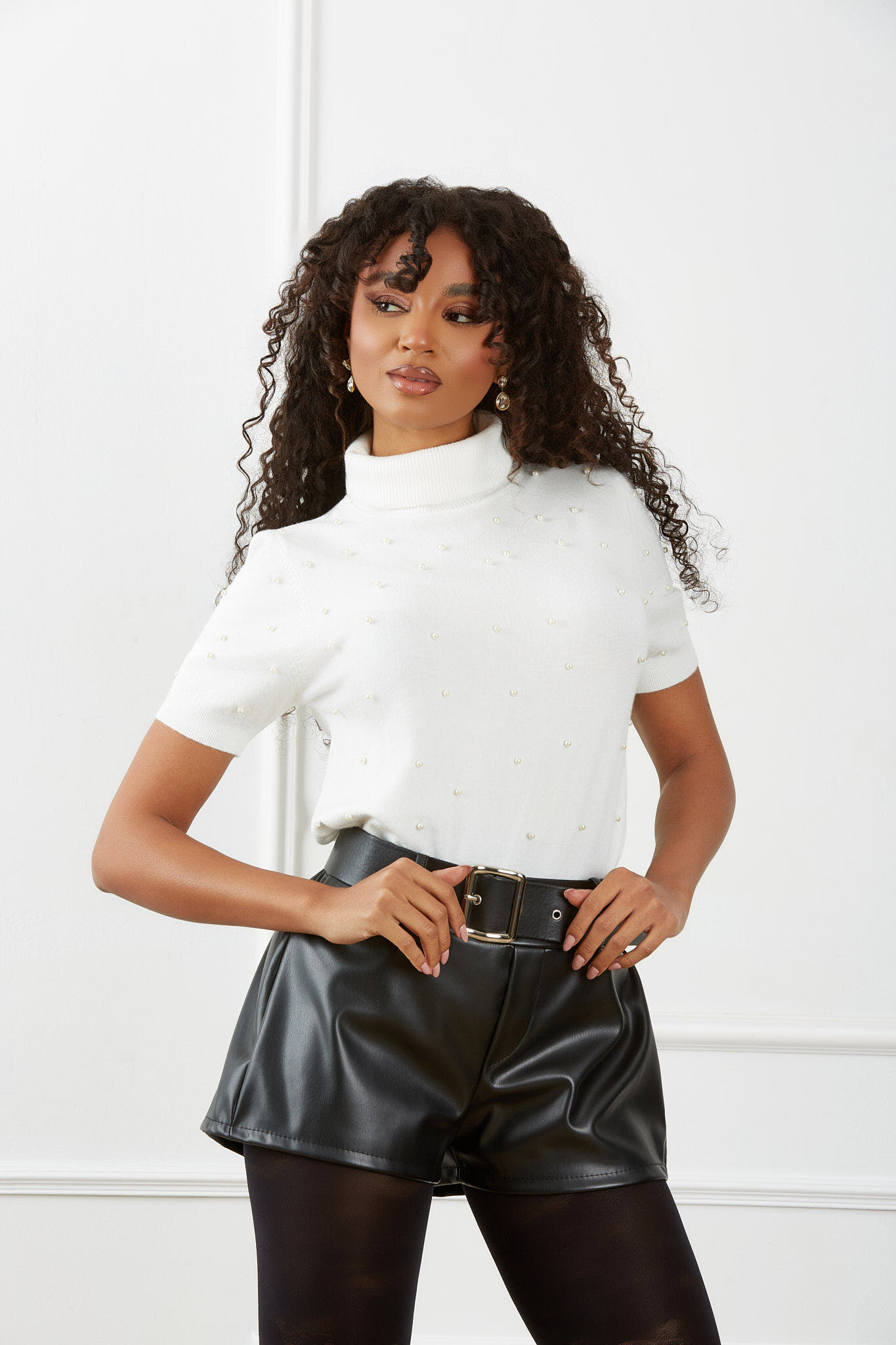 Εντυπωσιακό τοπ, με ελαφριά πλέξη που δεν προκαλεί δυσφορία. Λεπτομέρεια με πέρλες και ψηλή λαιμόκοψη. Μήκος 56cm,στήθος 44cm,μανίκι 25cm.