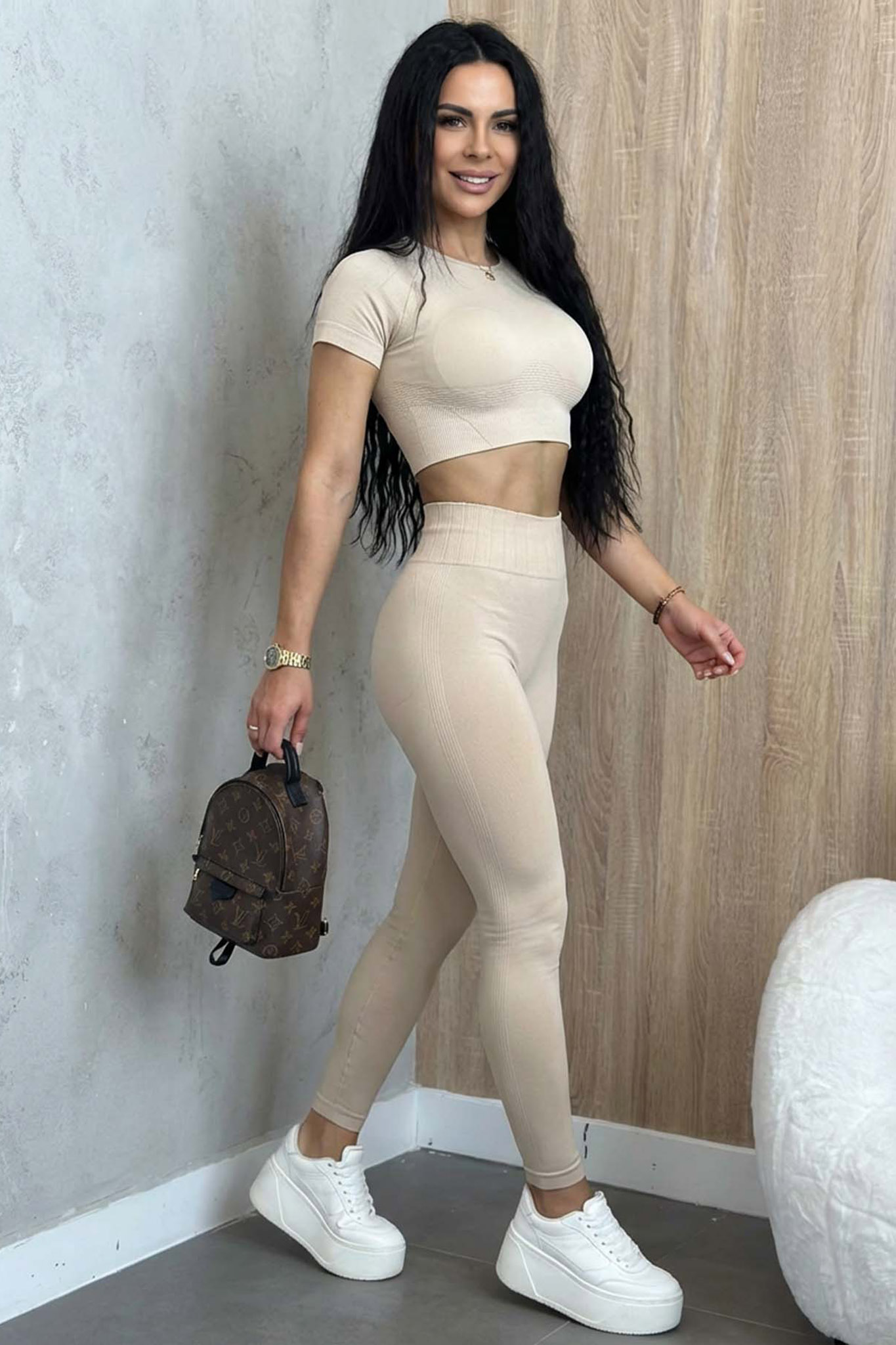 Το αθλητικό σύνολο αποτελείται από ένα κοντομάνικο crop top με στρογγυλή λαιμόκοψη και ένα ψηλόμεσο κολάν που σμιλεύει τη σιλουέτα. Κατασκευασμένο από ελαστικό ύφασμα υψηλής ποιότητας χωρίς ραφές, προσφέρει μέγιστη άνεση και σταθερή εφαρμογή, ενώ η φαρδιά μπάσκα στη μέση εξασφαλίζει ιδανικό κράτημα και κομψό αποτέλεσμα.
