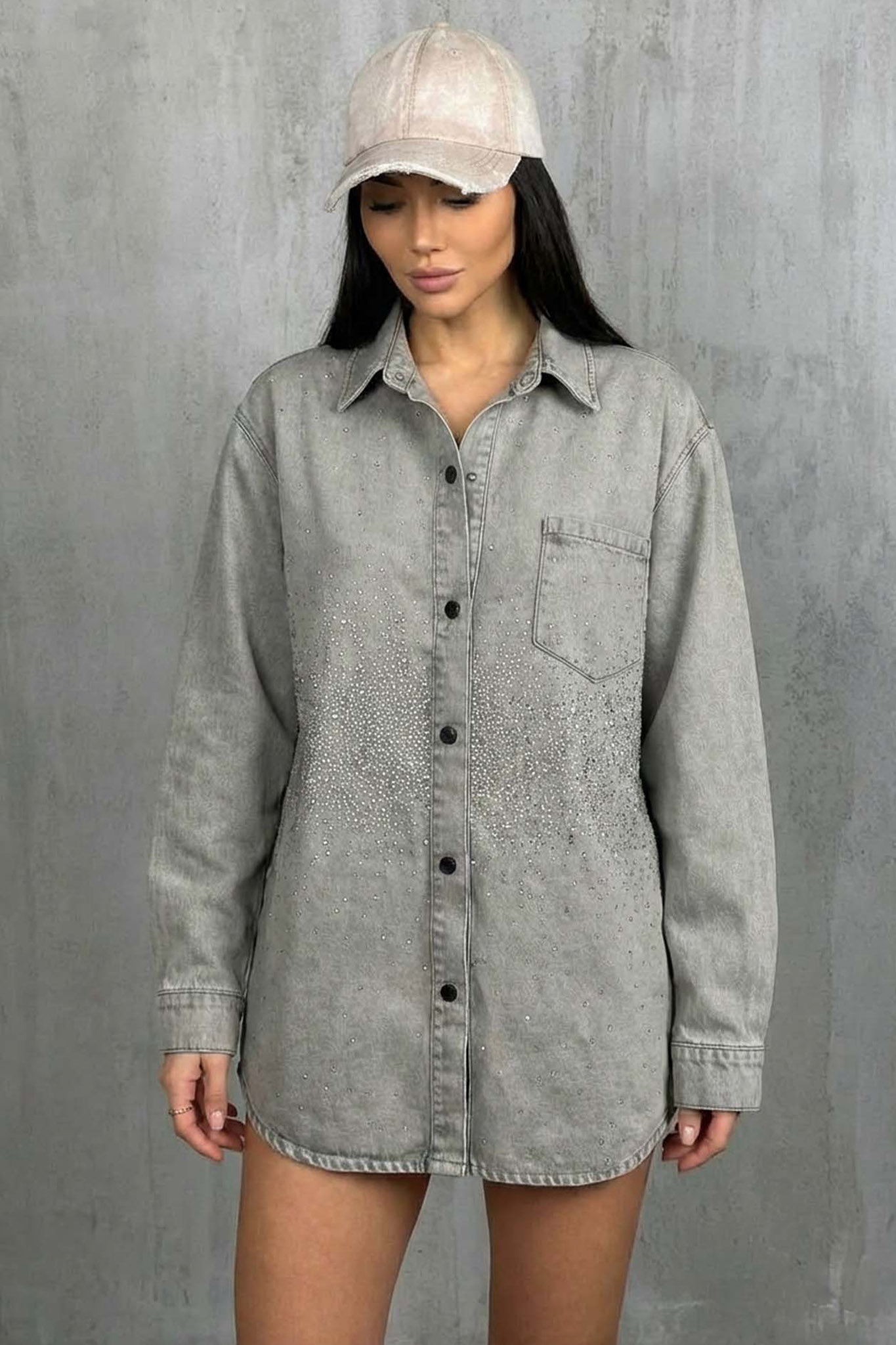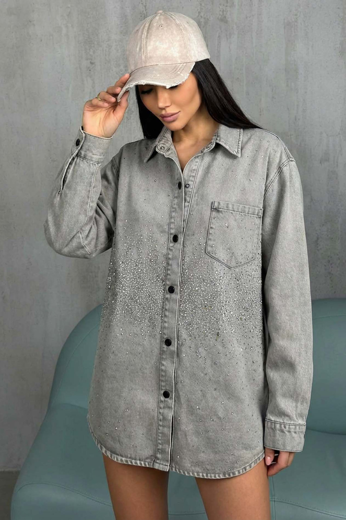 Oversized denim πουκάμισο το οποίο αποτελεί ένα εντυπωσιακό κομμάτι, καθώς συνδυάζει την άνεση της τζιν υφής με τη λάμψη από διάσπαρτα στρας που κοσμούν το μπροστινό μέρος. Διαθέτει κλασική γραμμή με γιακά, μεταλλικά κουμπιά και μια τσέπη στο στήθος.