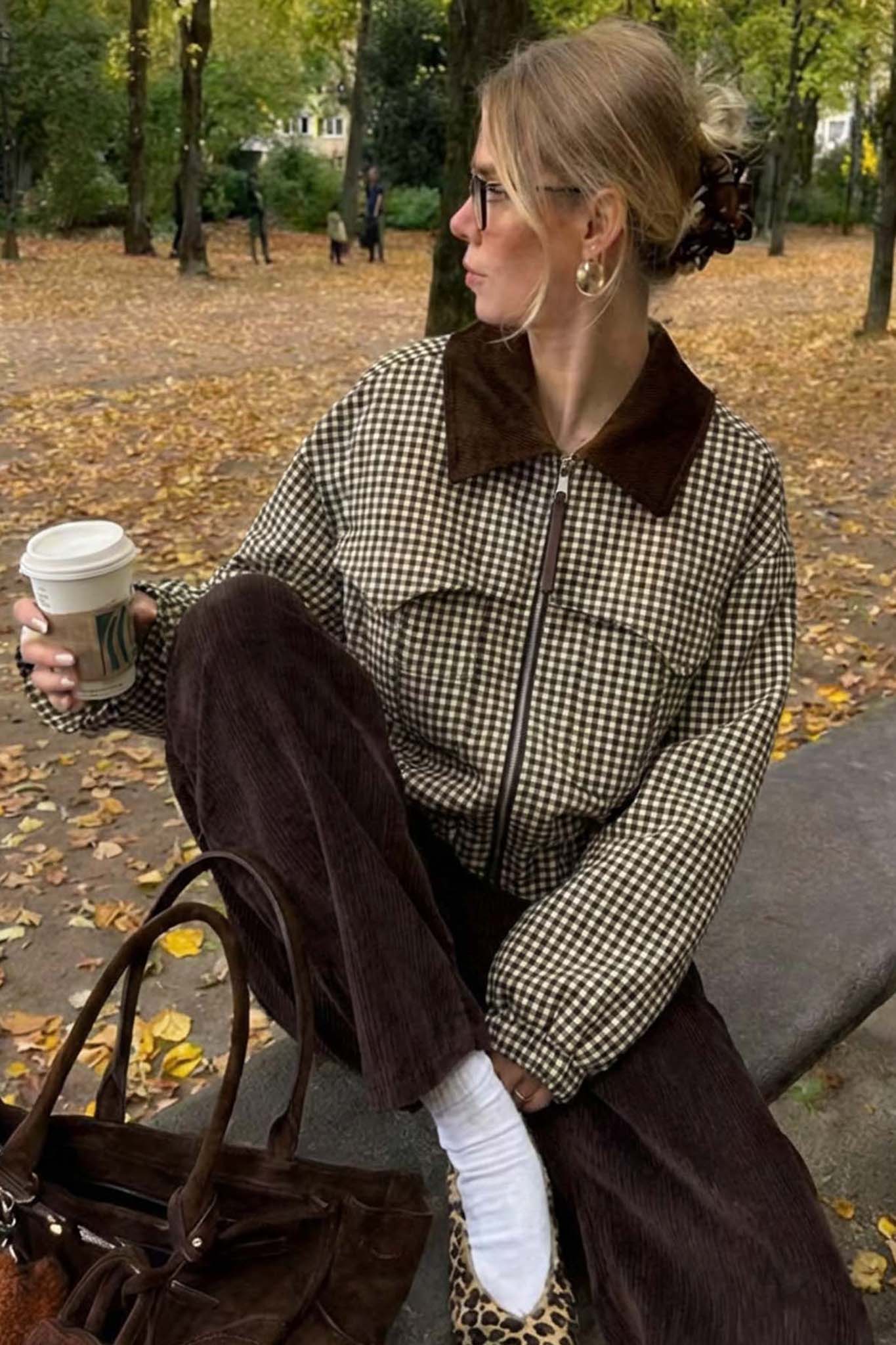 Καρό τζάκετ με κοτλέ γιακά σε κλασικό καφέ και μπεζ καρό μοτίβο αναδεικνύοντας μια ρετρό αίσθηση.
