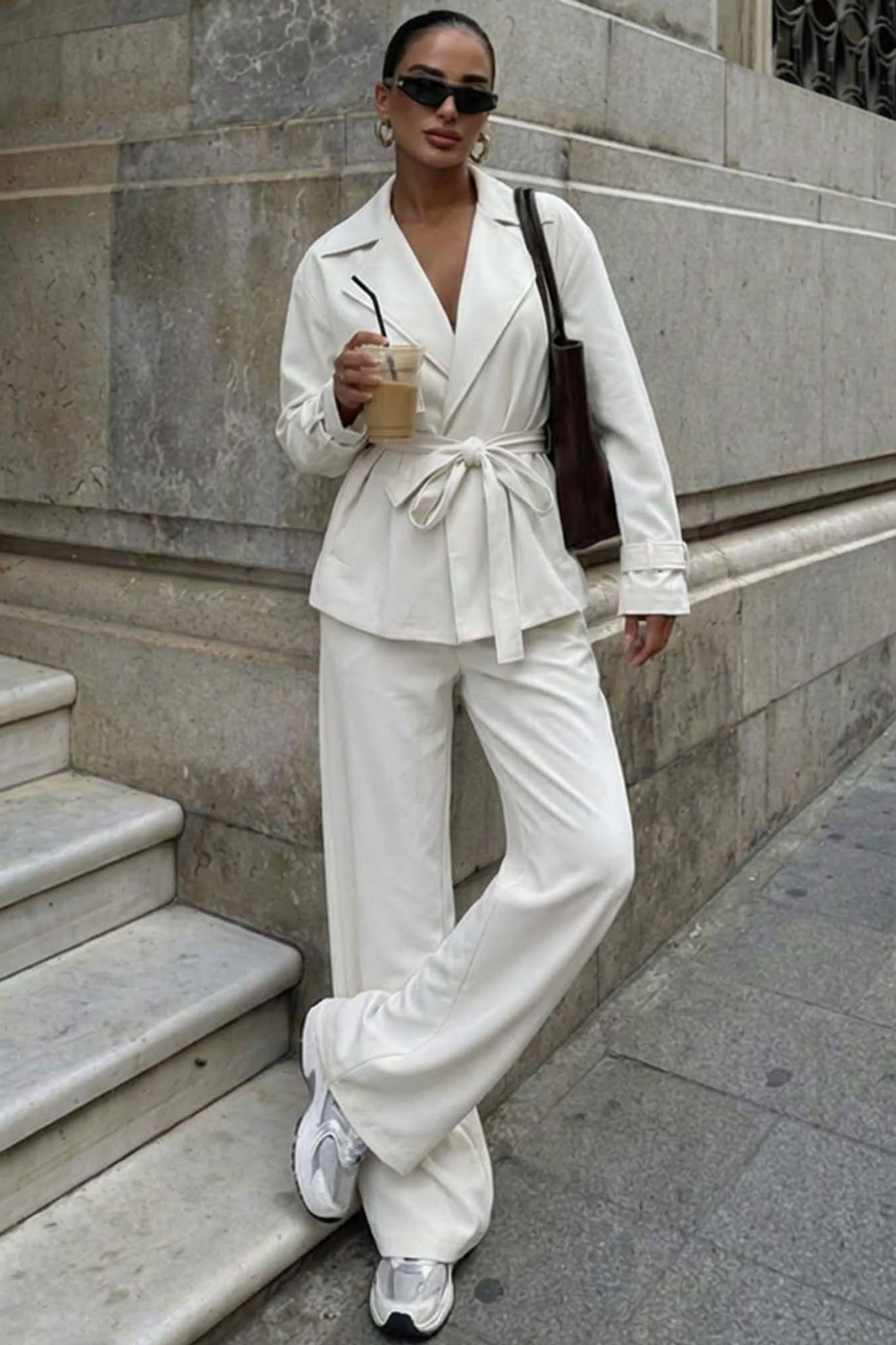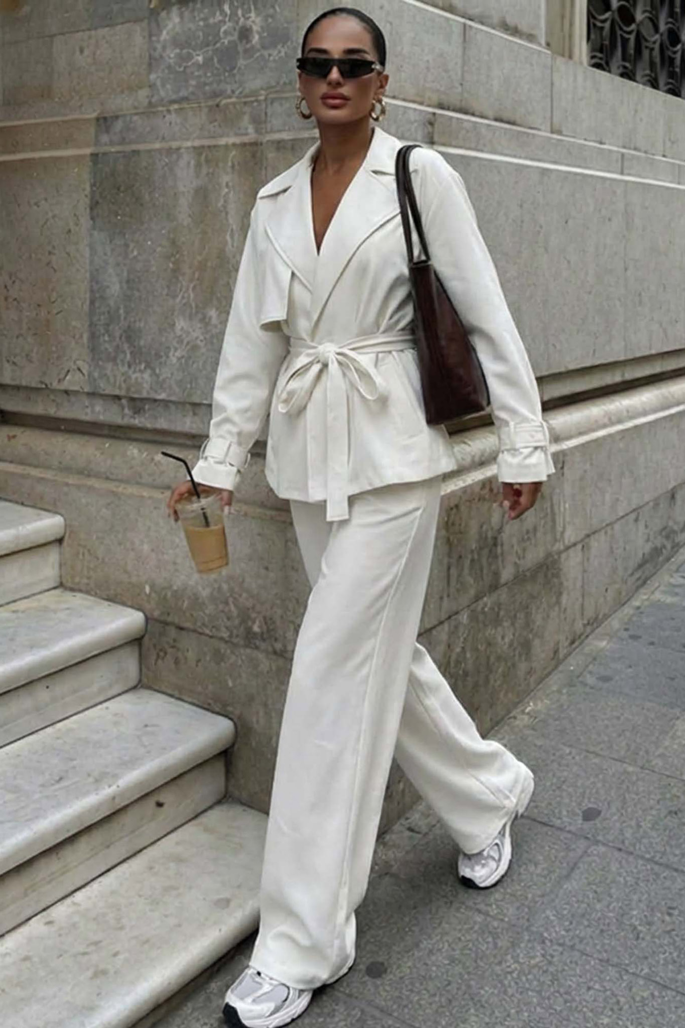 Σετ κοντή καπαρντίνα με παντελόνα. Το short trench jacket διαθέτει κλασικό γιακά με πέτο και αποσπώμενη ζώνη που τονίζει τη μέση, προσδίδοντας μια δομημένη αλλά ανάλαφρη σιλουέτα. Συνοδεύεται από παντελόνα σε ίσια, φαρδιά γραμμή.