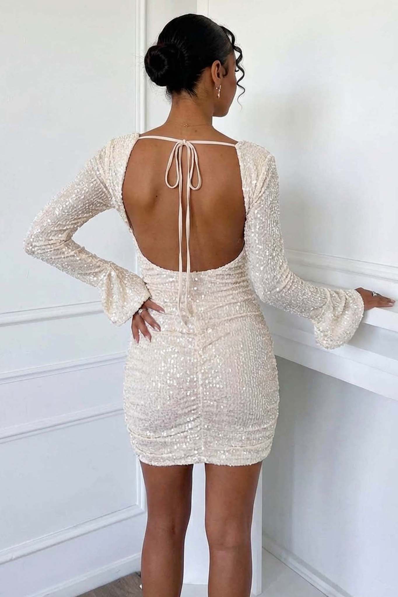 Φόρεμα μίνι βελούδινο μακρυμάνικο με καμπάνα μανίκι. Εφαρμοστό στο σώμα, αρκετά slim, σμιλεύει τη σιλουέτα. Τετράγωνο ντεκολτέ. Καλύπτει small μέγεθος.