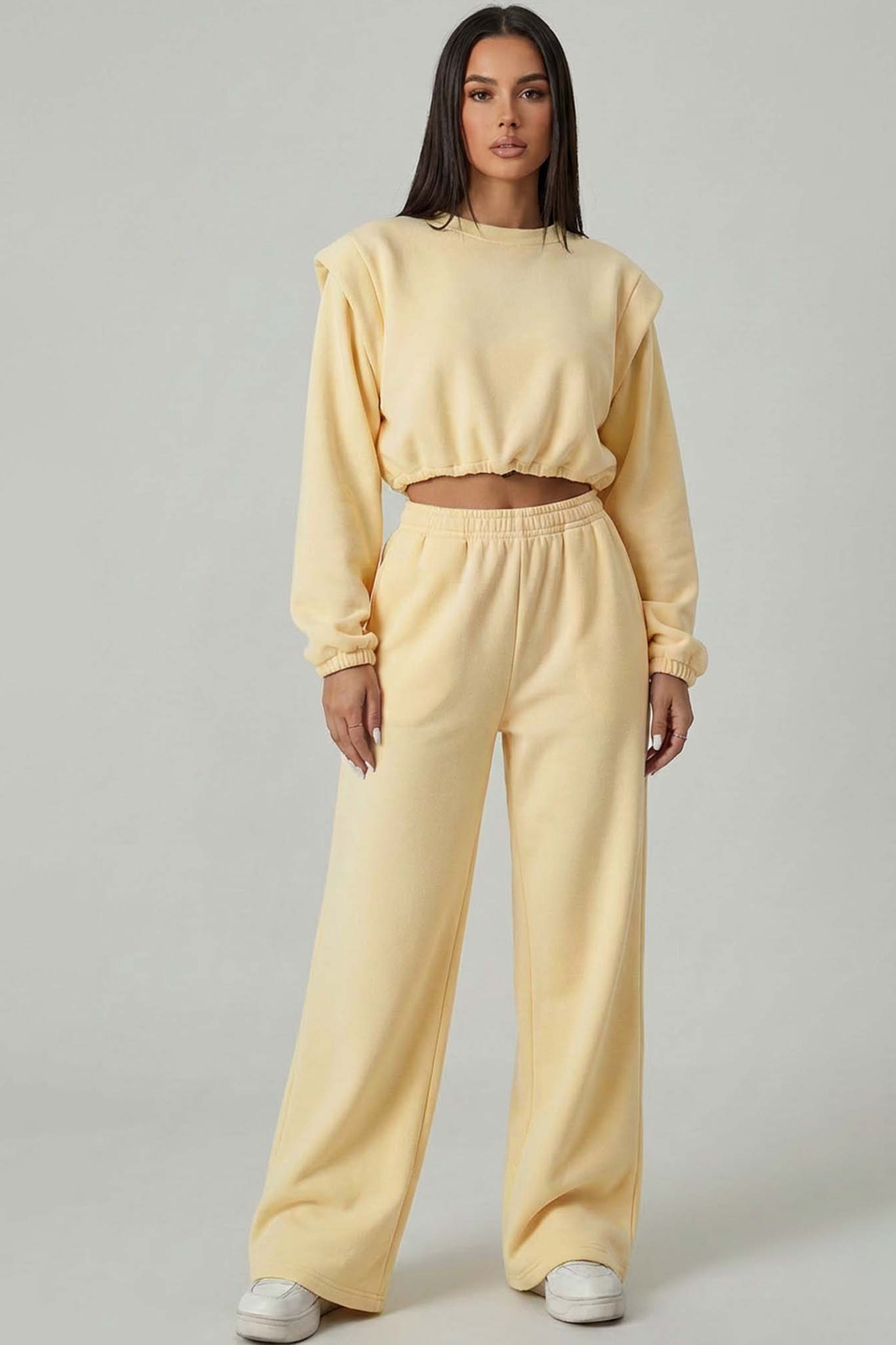 Σετ που αποτελείται από μοντέρνο cropped φούτερ και άνετο παντελόνι σε ίσια γραμμή. Ιδανικό για casual εμφανίσεις με άνεση και στυλ όλη μέρα.