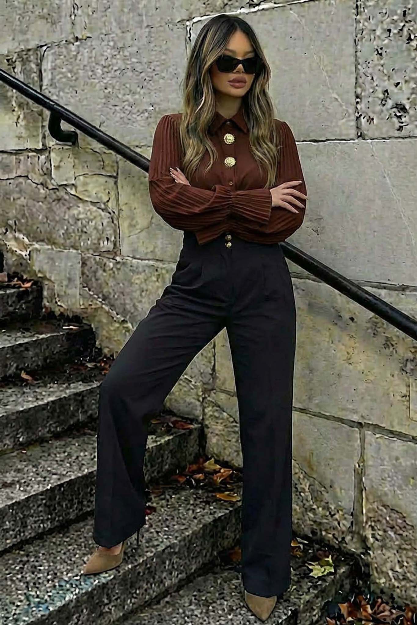 Πουκάμισο σε μονοχρωμία, διαθέτει γιακά, κουμπιά σε χρυσή απόχρωση και μακριά μανίκια με όγκο που καταλήγουν σε τελείωμα καμπάνα. Προσφέρει θηλυκό και elegant αποτέλεσμα. Ιδανική επιλογή για chic καθημερινές αλλά και πιο βραδινές εμφανίσεις.