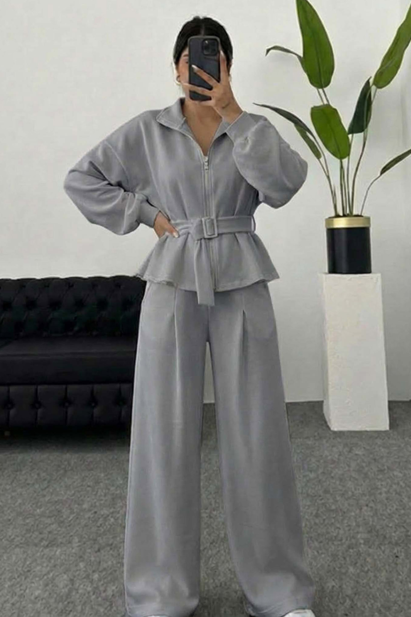 Σετ ζακέτα και παντελόνι σε φούτερ ύφανση. ’νετη εφαρμογή. Με ενσωματωμένη ζώνη που αναδεικνύει την σιλουέτα. Προσφέρει ένα casual chic αποτέλεσμα. Ιδανική επιλογή για καθημερινές εμφανίσεις και χαλαρές βόλτες. Μήκος 58cm, στήθος 120cm, μανικι 55cm, μήκος 105cm, μεση 70cm.