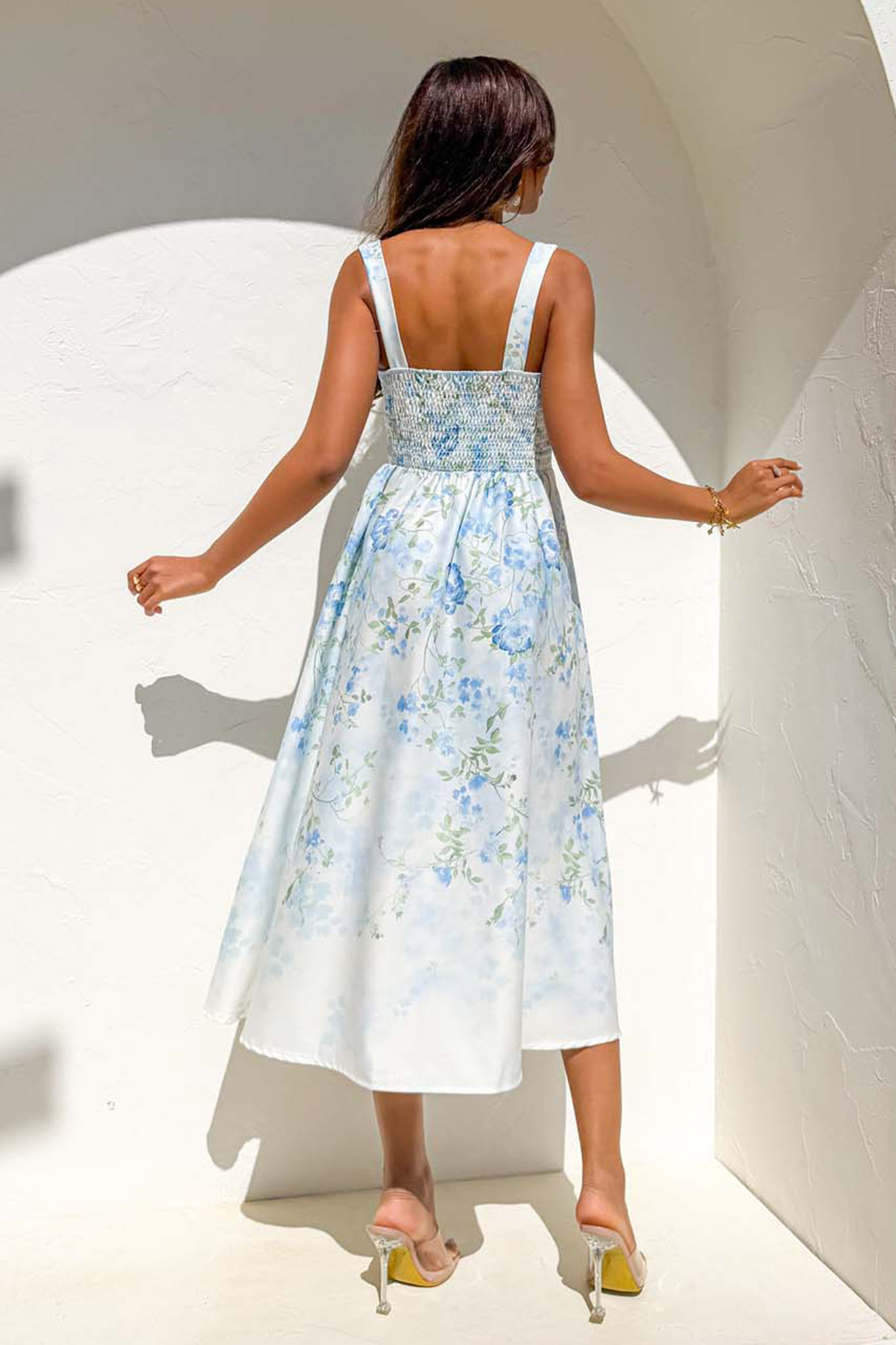 Μίντι φλοράλ φορέμα σε γραμμή άλφα, τα οποία διαθέτουν φαρδιές τιράντες, ντεκολτέ σε σχήμα καρδιάς με ενισχυμένα cups και διακοσμητικά κουμπιά στο μπροστινό μέρος.