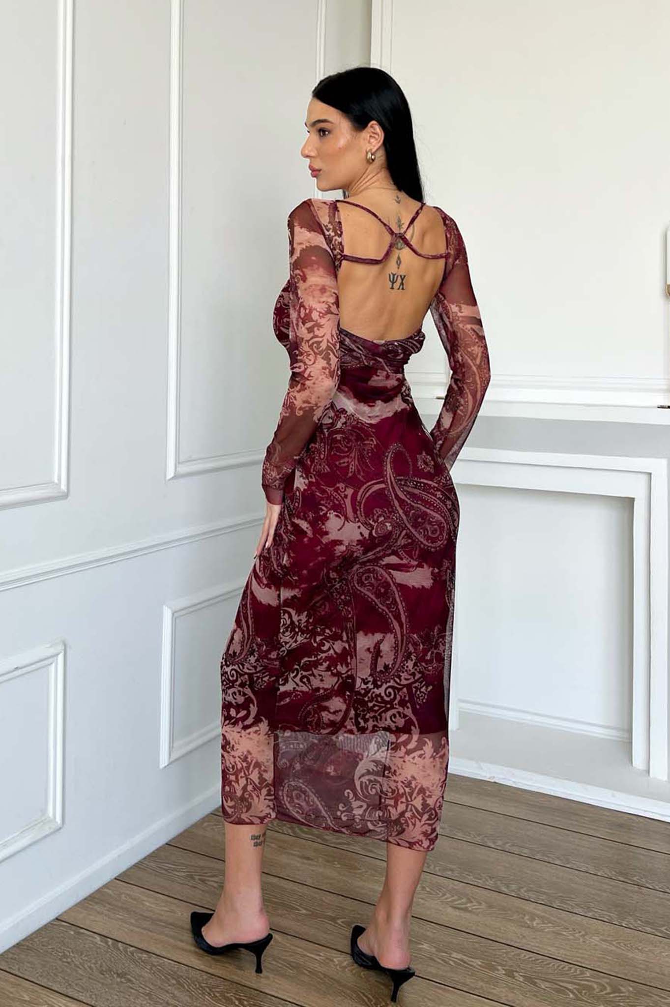 Μίντι φόρεμα εμπριμέ με διαφάνεια και χιαστί σχέδιο στην πλάτη. Μήκος 145cm, στήθος 40cm, μανίκι 70cm