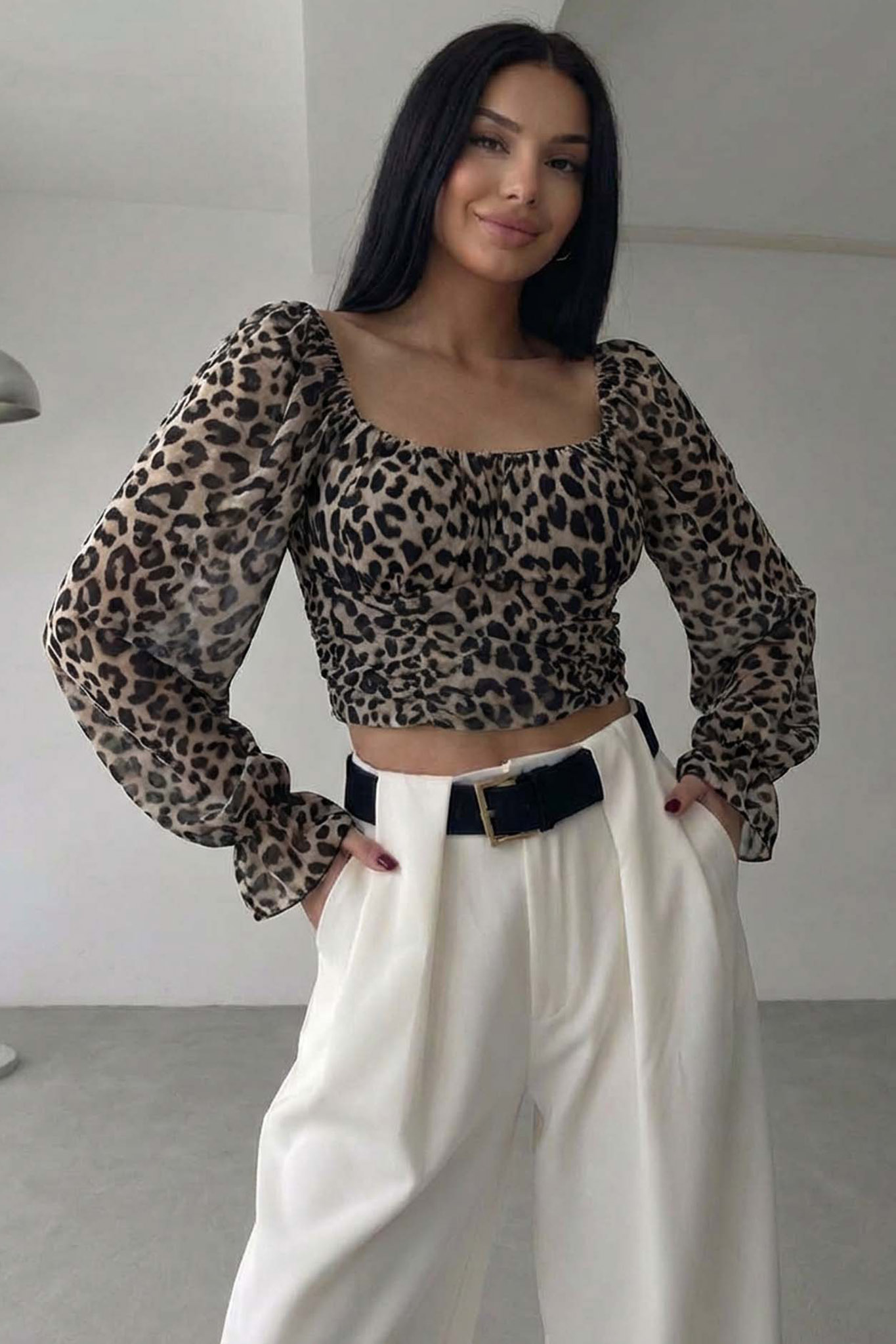 cropped μπλούζα συνδυάζει τη ρομαντική αισθητική με τις σύγχρονες τάσεις. Διαθέτει θηλυκή τετράγωνη λαιμόκοψη, εντυπωσιακά ημιδιάφανα balloon μανίκια και λεπτομέρειες με σούρες. Mήκος 42cm, στήθος 40cm, μανίκι 65cm.