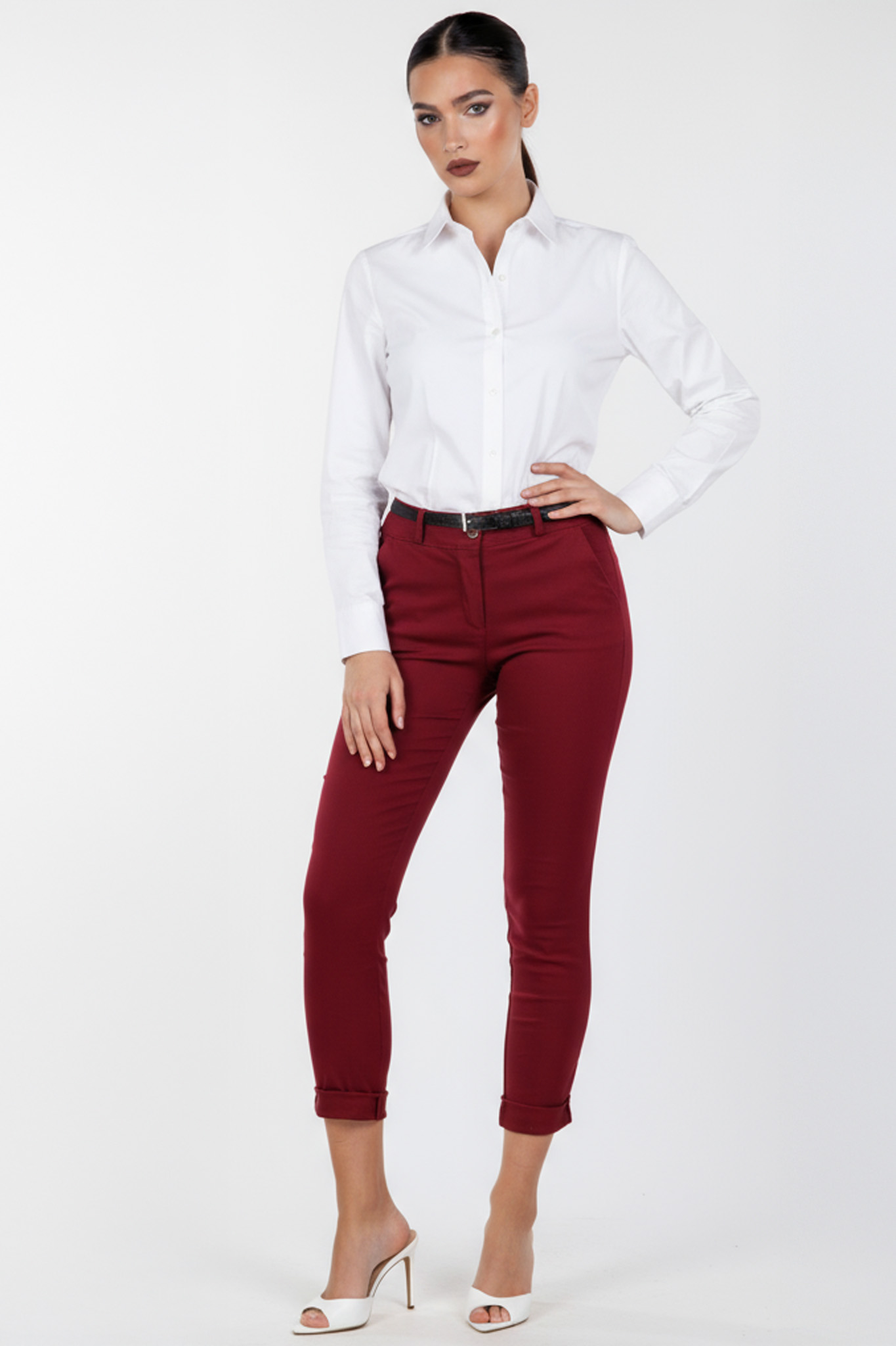 Παντελόνι σε εφαρμοστή γραμμή με ρεβέρ στο τελείωμα και λεπτή ζώνη στη μέση. Κομψό και ευκολοφόρετο, ιδανικό για office look αλλά και smart casual εμφανίσεις. Συνδυάζεται άψογα με πουκάμισα ή πλεκτά για ολοκληρωμένα σύνολα.