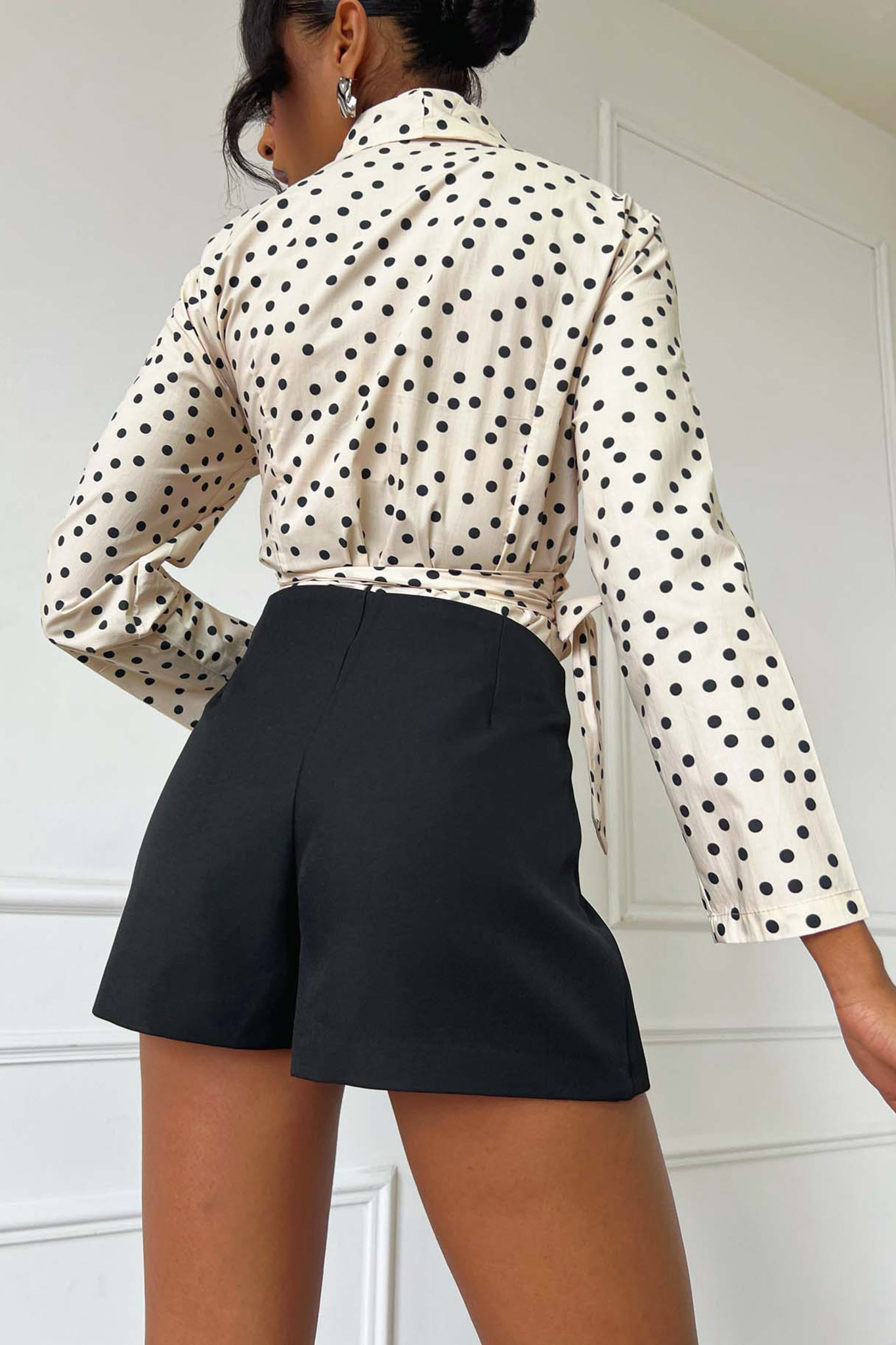 Ψηλόμεση Μίνι Φούστα-Σορτς με Εντυπωσιακή Χρυσή Αγκράφ. Ψηλόμεση (high-rise) εφαρμογή που αναδεικνύει τη μέση και επιμηκύνει τα πόδια, με κρουαζέ (wrap) κλείσιμο στο μπροστινό μέρος.