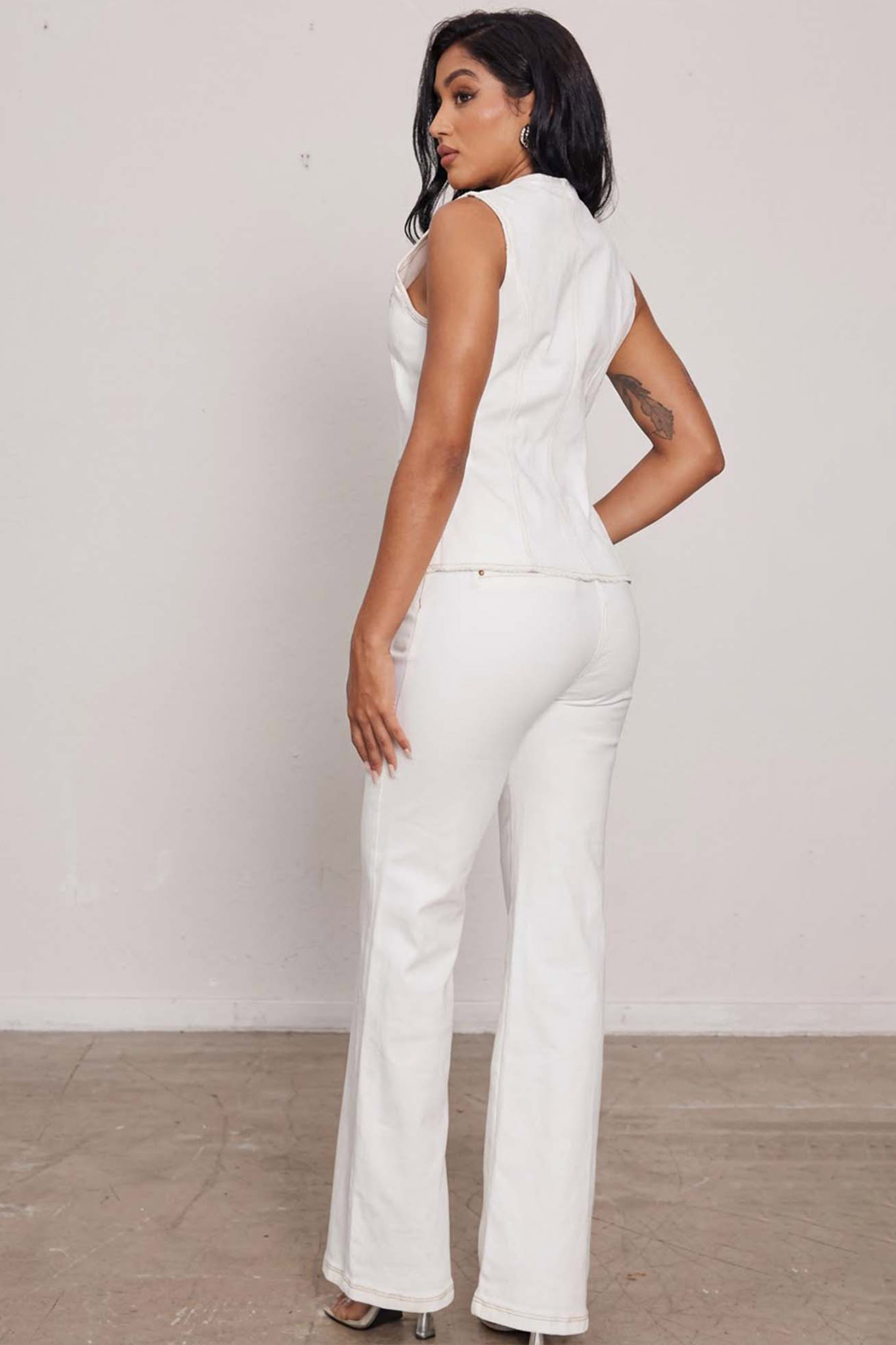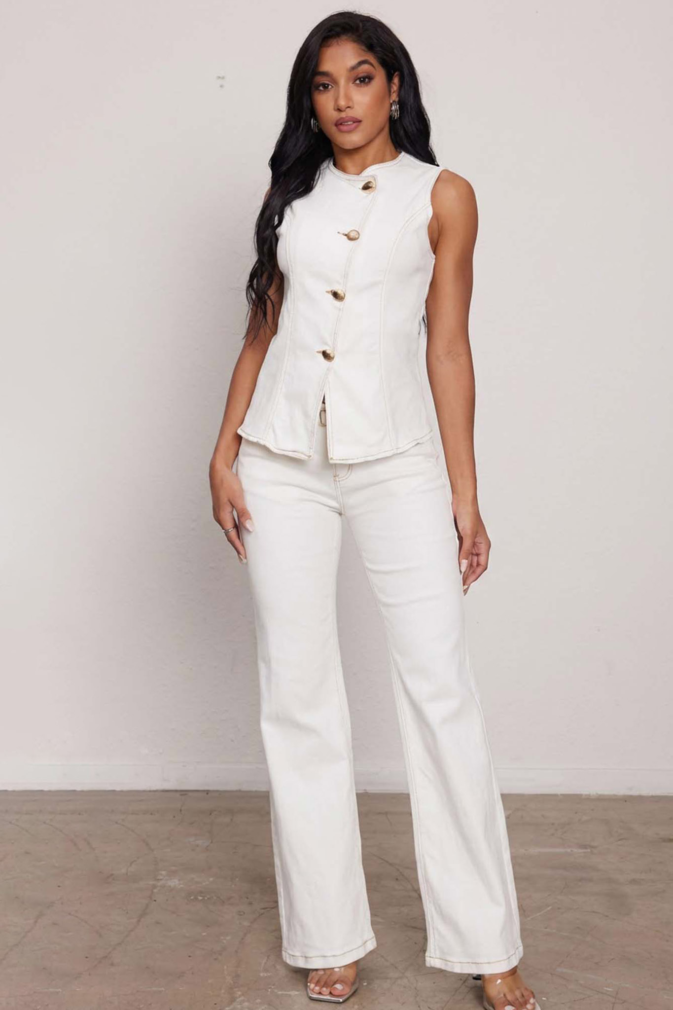 Σετ το οποίο αποτελείται από ένα αμάνικο denim top με εφαρμοστή γραμμή, που διακρίνεται για τα πολυτελή χρυσά κουμπιά στο μπροστινό μέρος και το κομψό ασύμμετρο τελείωμα που αναδεικνύει τη μέση. Συνοδεύεται από ένα ψηλόμεσο τζιν παντελόνι σε γραμμή wide-leg.