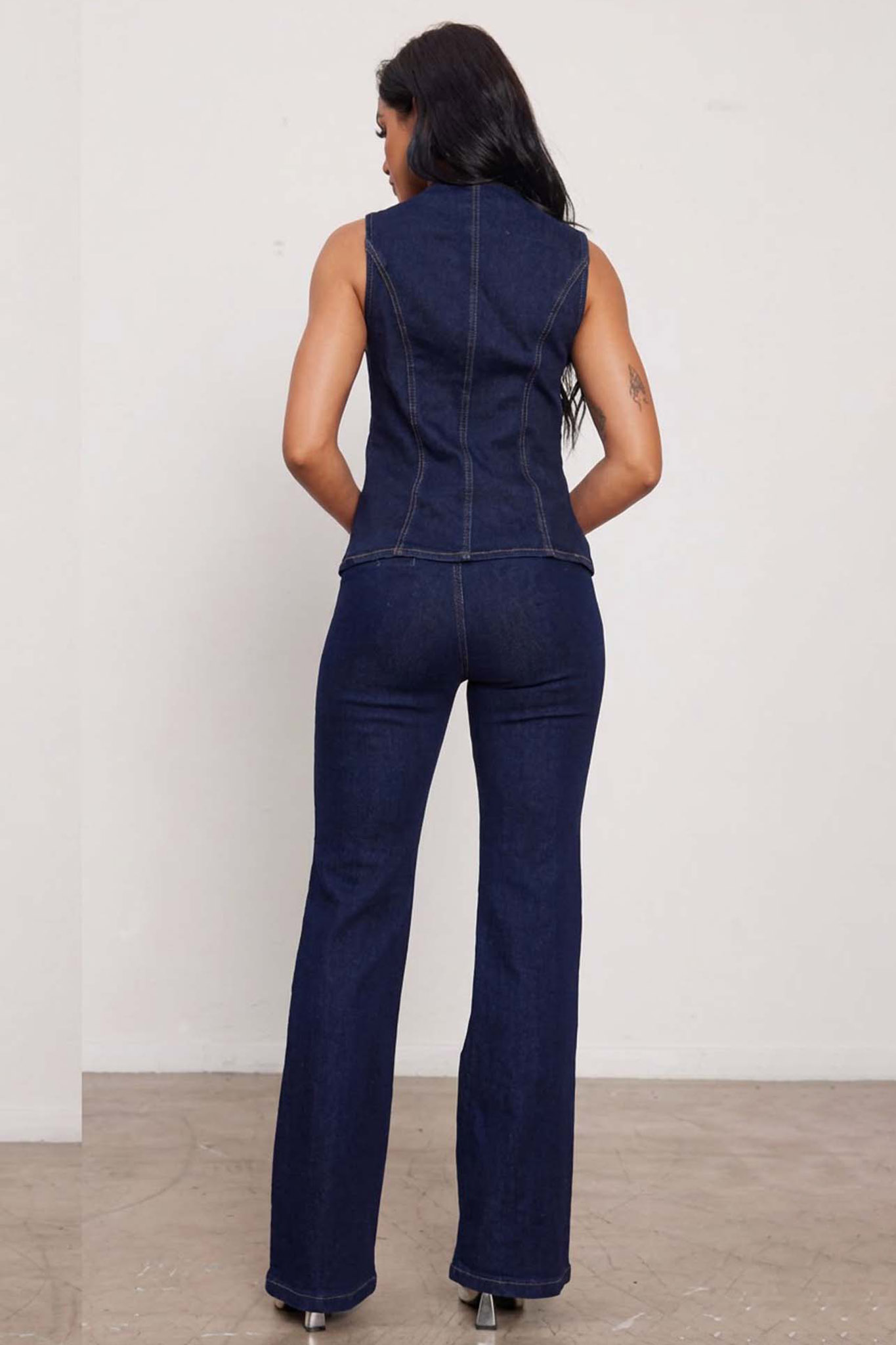 Σετ το οποίο αποτελείται από ένα αμάνικο denim top με εφαρμοστή γραμμή, που διακρίνεται για τα πολυτελή χρυσά κουμπιά στο μπροστινό μέρος και το κομψό ασύμμετρο τελείωμα που αναδεικνύει τη μέση. Συνοδεύεται από ένα ψηλόμεσο τζιν παντελόνι σε γραμμή wide-leg.