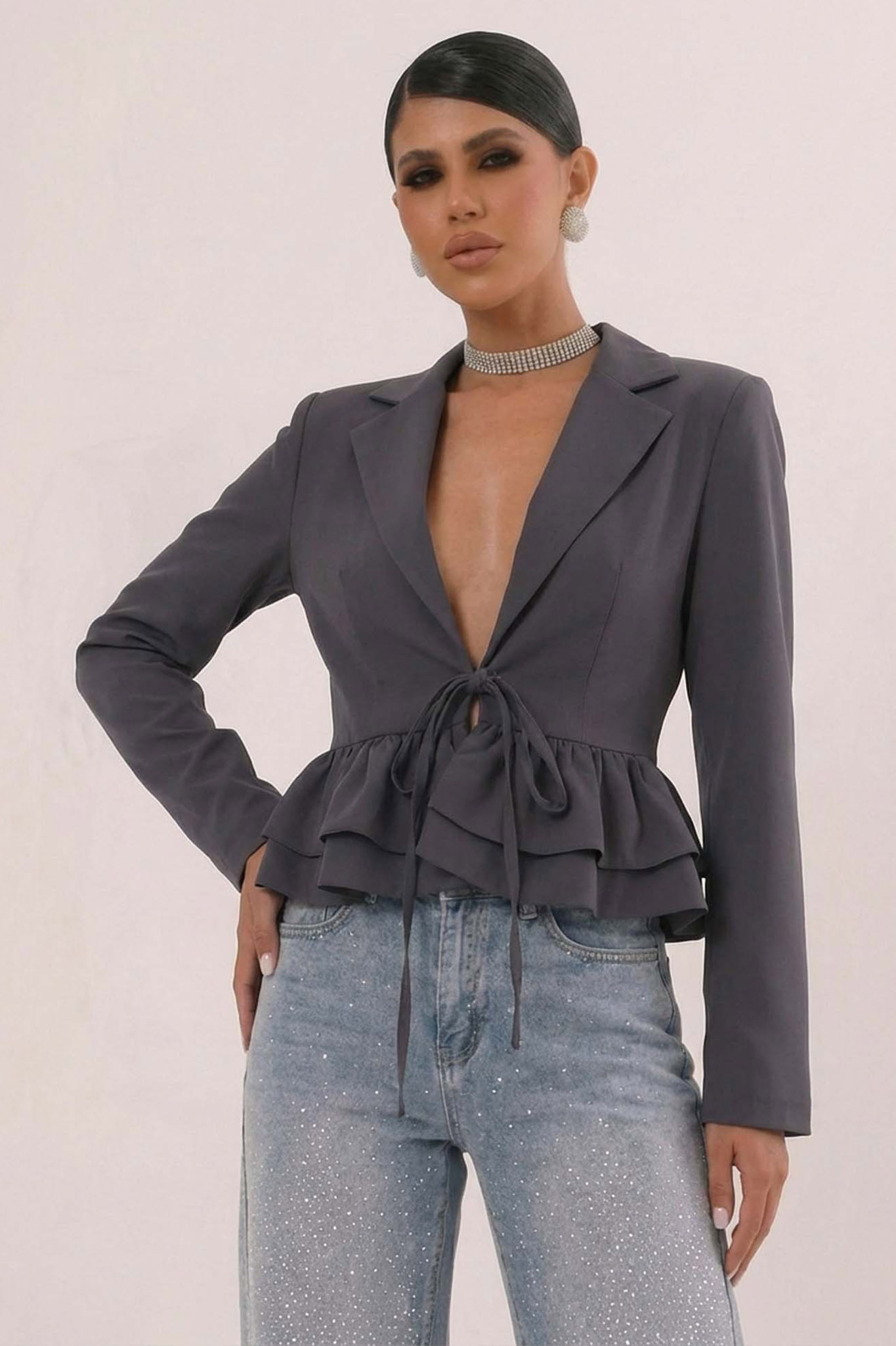 Κοντό σακάκι με δέσιμο με κορδόνια και βολάν στο τελείωμα. Διαθέτει πέτο και μπορεί να φορεθεί και ως ζακέτα. Ιδανική επιλογή για casual και ιδιαίτερες εμφανίσεις!