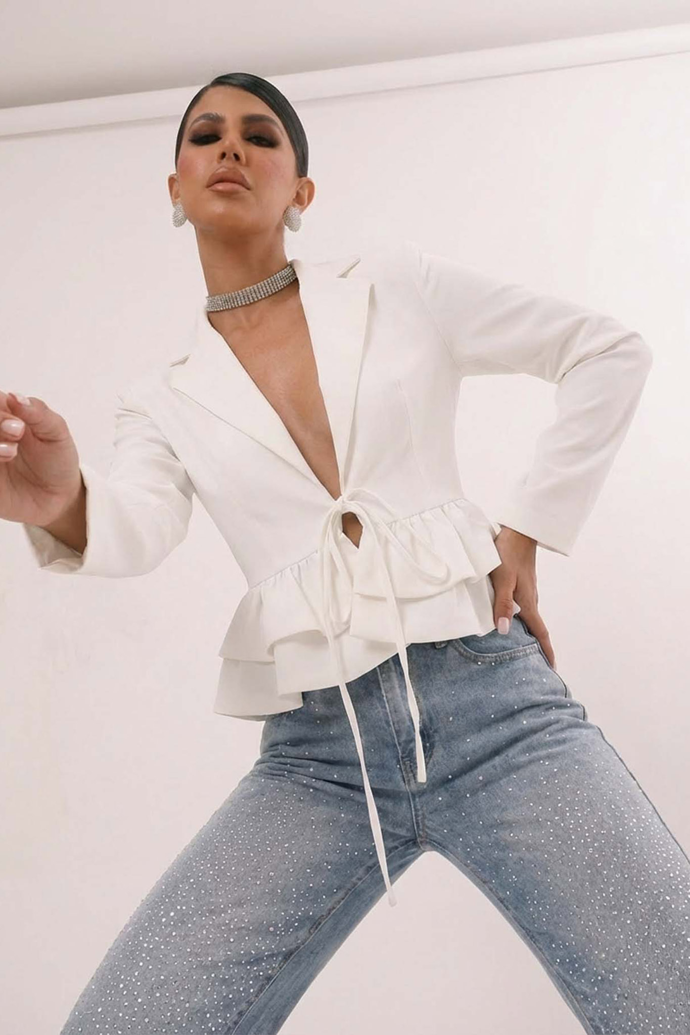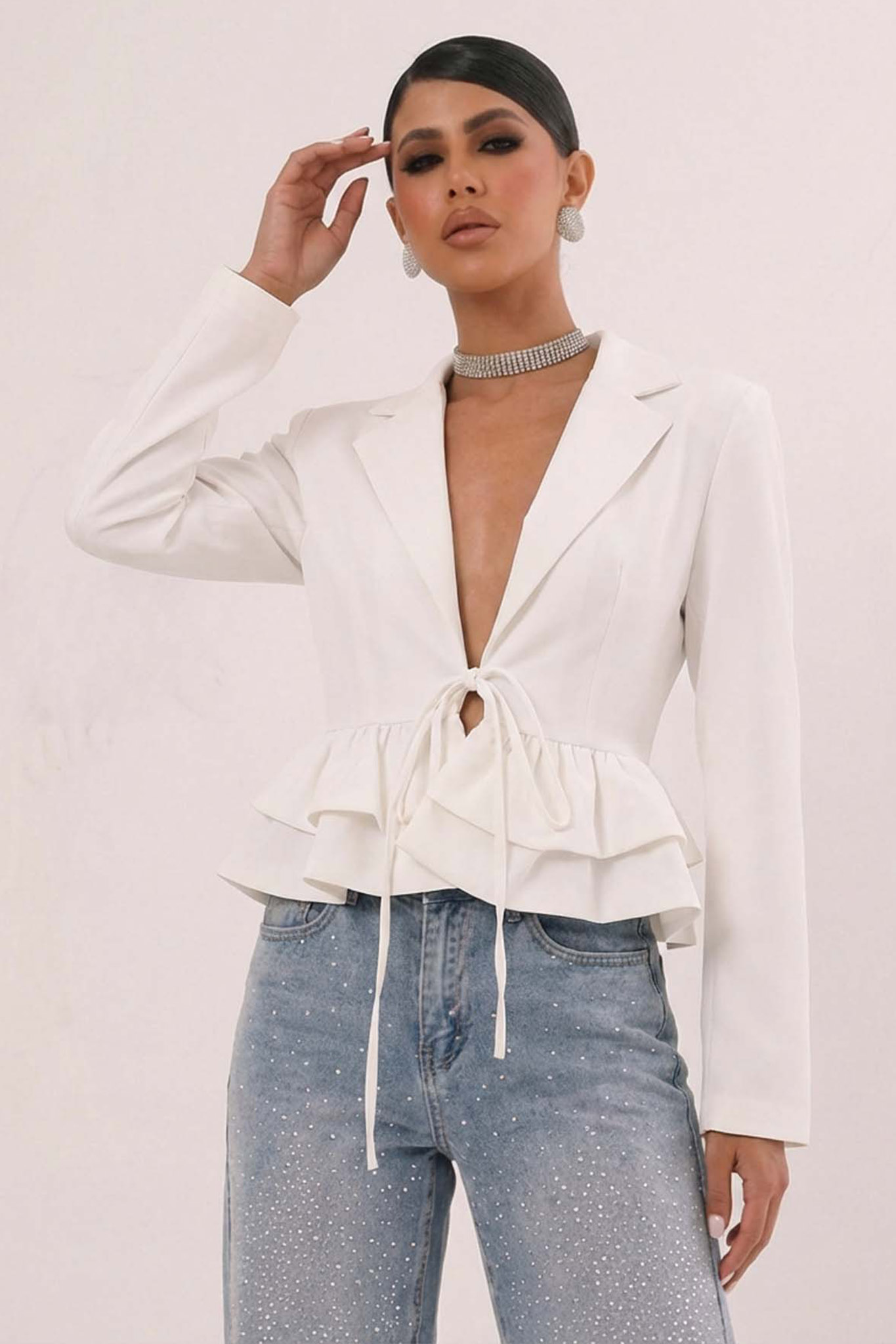 Κοντό σακάκι με δέσιμο με κορδόνια και βολάν στο τελείωμα. Διαθέτει πέτο και μπορεί να φορεθεί και ως ζακέτα. Ιδανική επιλογή για casual και ιδιαίτερες εμφανίσεις!
