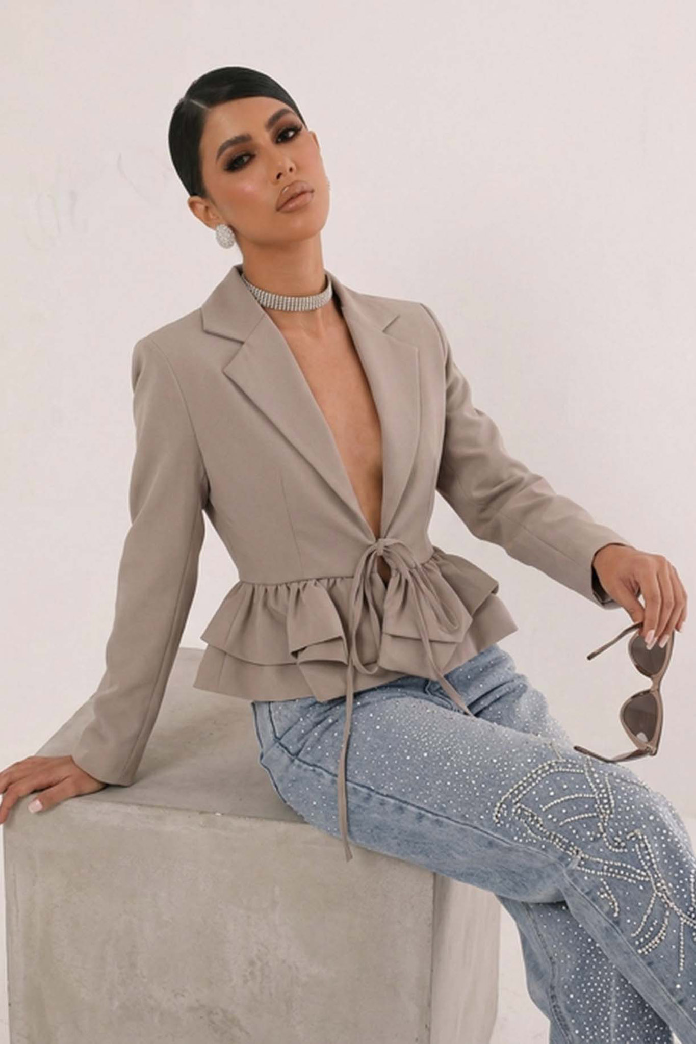 Κοντό σακάκι με δέσιμο με κορδόνια και βολάν στο τελείωμα. Διαθέτει πέτο και μπορεί να φορεθεί και ως ζακέτα. Ιδανική επιλογή για casual και ιδιαίτερες εμφανίσεις!