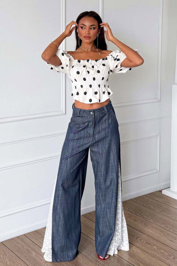 Wide-Leg Τζιν Παντελόνι. Διαθέτει high-waisted (ψηλόμεση) εφαρμογή και φαρδιά, ίσια μπατζάκια (wide-leg), προσφέροντας μια μοντέρνα και άνετη αίσθηση όλη μέρα. Small μέγεθος μήκος 103cm, μέση 70cm.