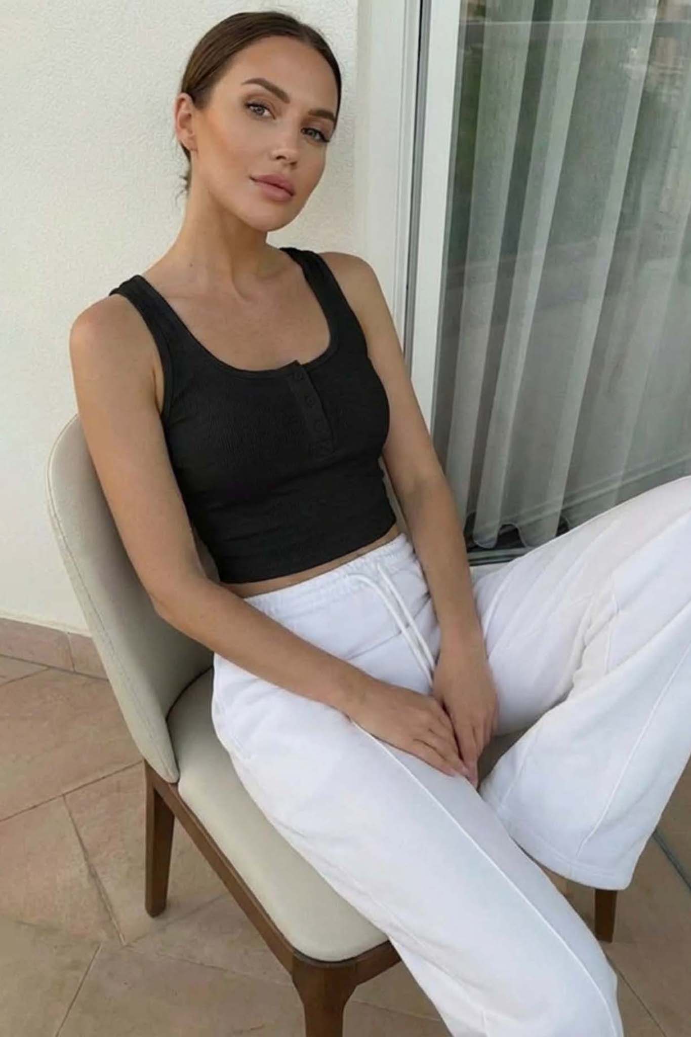 Αμάνικο με στενή εφαρμογή. Διαθέτει στρογγυλή λαιμόκοψη και κουμπιά στο μπροστινό μέρος του στήθους. Είναι κατασκευασμένο από ελαστικό ριπ ύφασμα, το οποίο του προσδίδει ανάγλυφη υφή και άνεση στην κίνηση.
