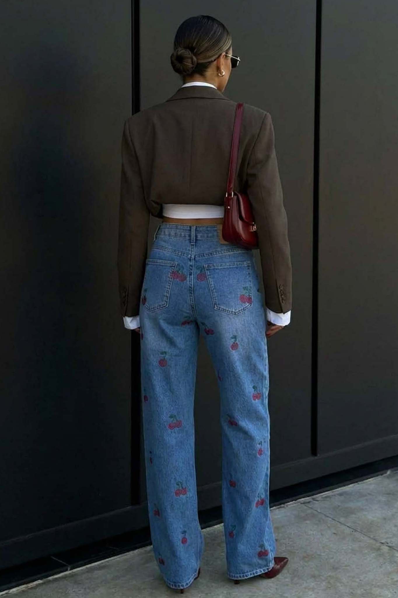 Τζιν παντελόνι με κεντητά διακοσμητικά κερασάκια.