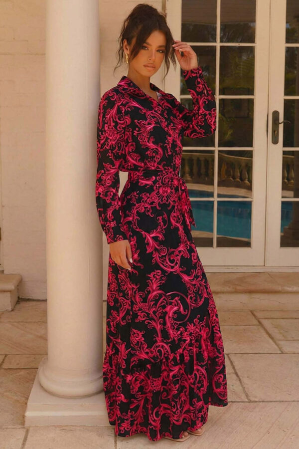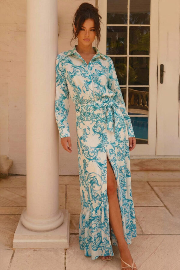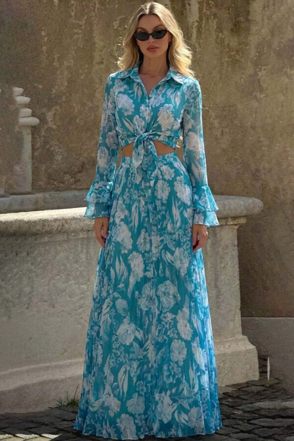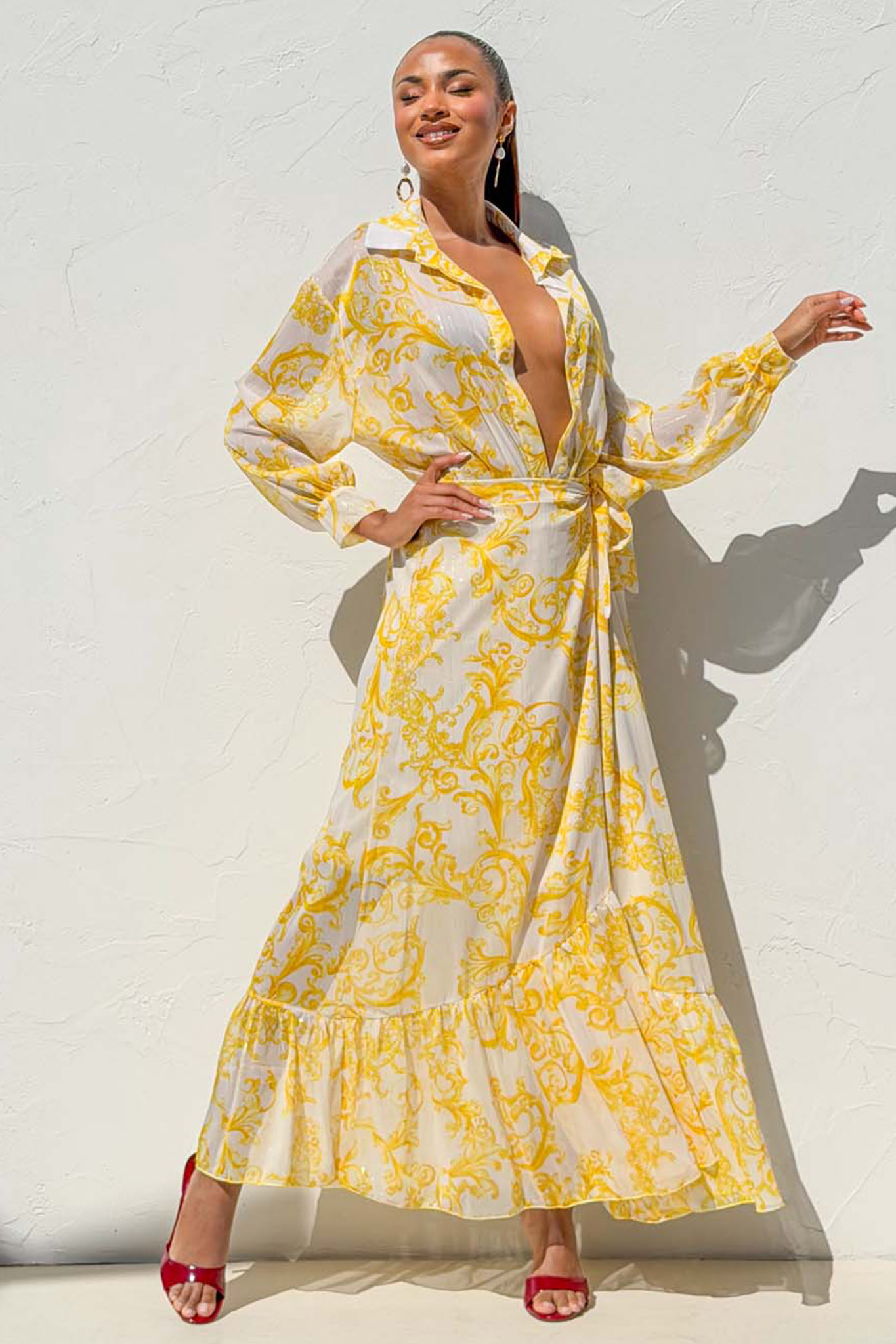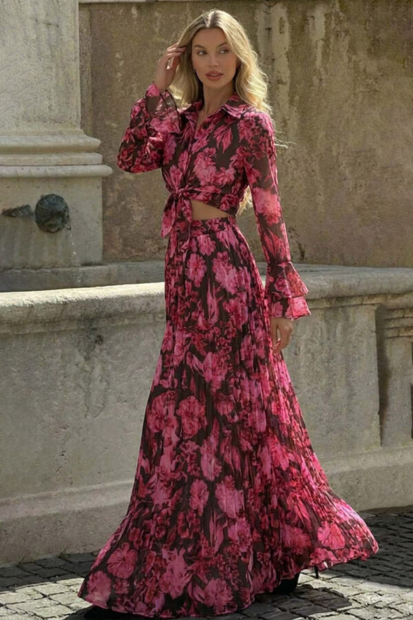 Σετ πουκάμισο-φούστα με λαχούρια. Αποτελείται από ένα chic πουκάμισο με κλασικό γιακά και μια εντυπωσιακή maxi φούστα με βολάν στο τελείωμα, ενώ η δετή ζώνη στη μέση κολακεύει ιδανικά τη σιλουέτα. Το διαχρονικό paisley print (λαχούρια) και το ανάλαφρο ύφασμά του προσφέρουν μια αίσθηση πολυτέλειας και άνεσης.