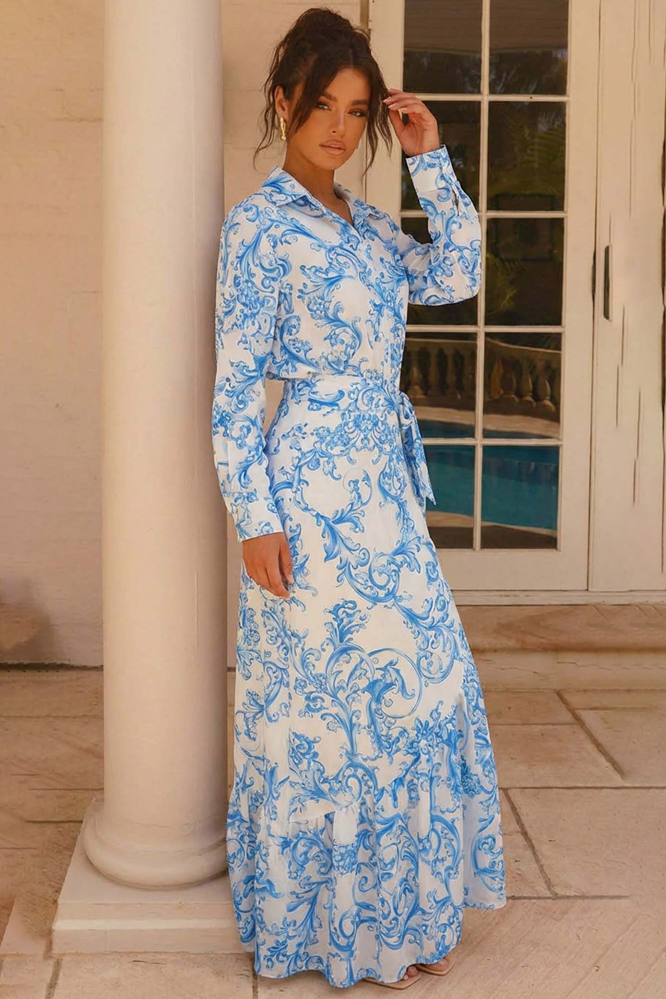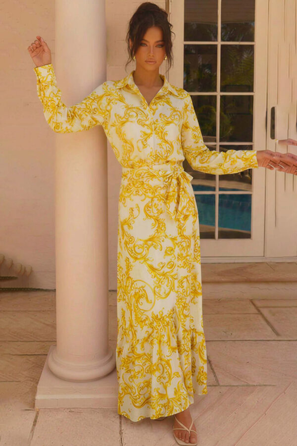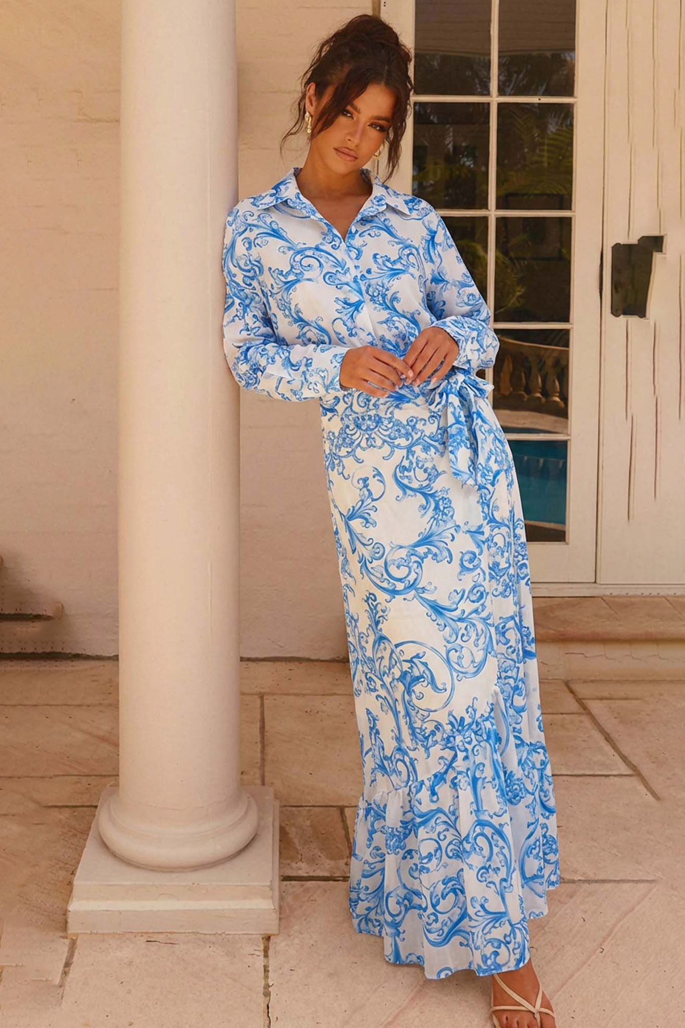 Σετ πουκάμισο-φούστα με λαχούρια. Αποτελείται από ένα chic πουκάμισο με κλασικό γιακά και μια εντυπωσιακή maxi φούστα με βολάν στο τελείωμα, ενώ η δετή ζώνη στη μέση κολακεύει ιδανικά τη σιλουέτα. Το διαχρονικό paisley print (λαχούρια) και το ανάλαφρο ύφασμά του προσφέρουν μια αίσθηση πολυτέλειας και άνεσης.