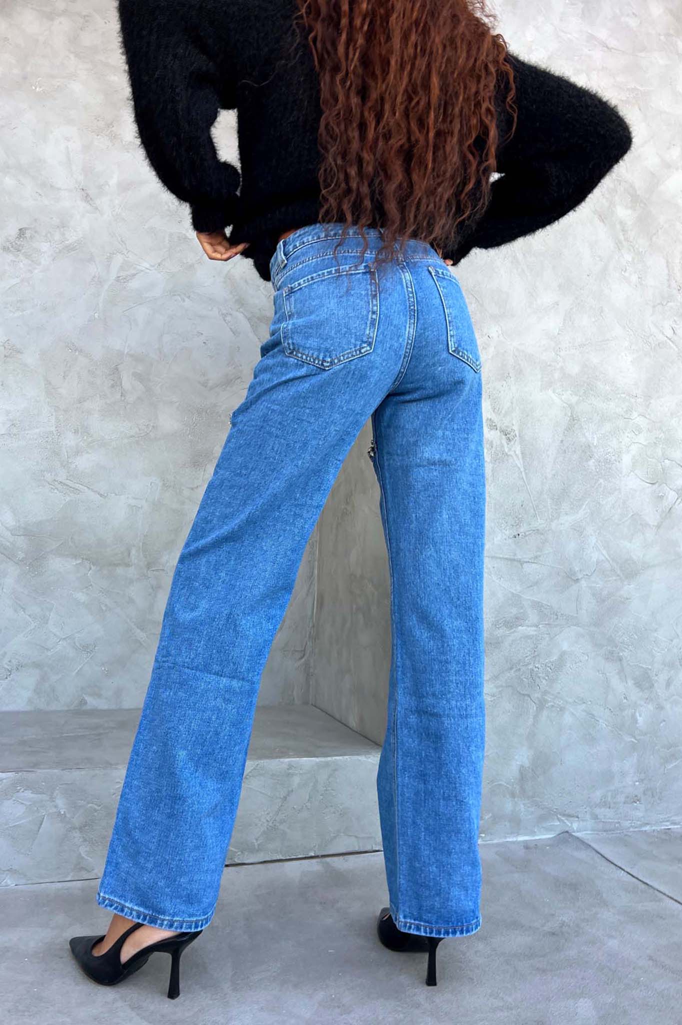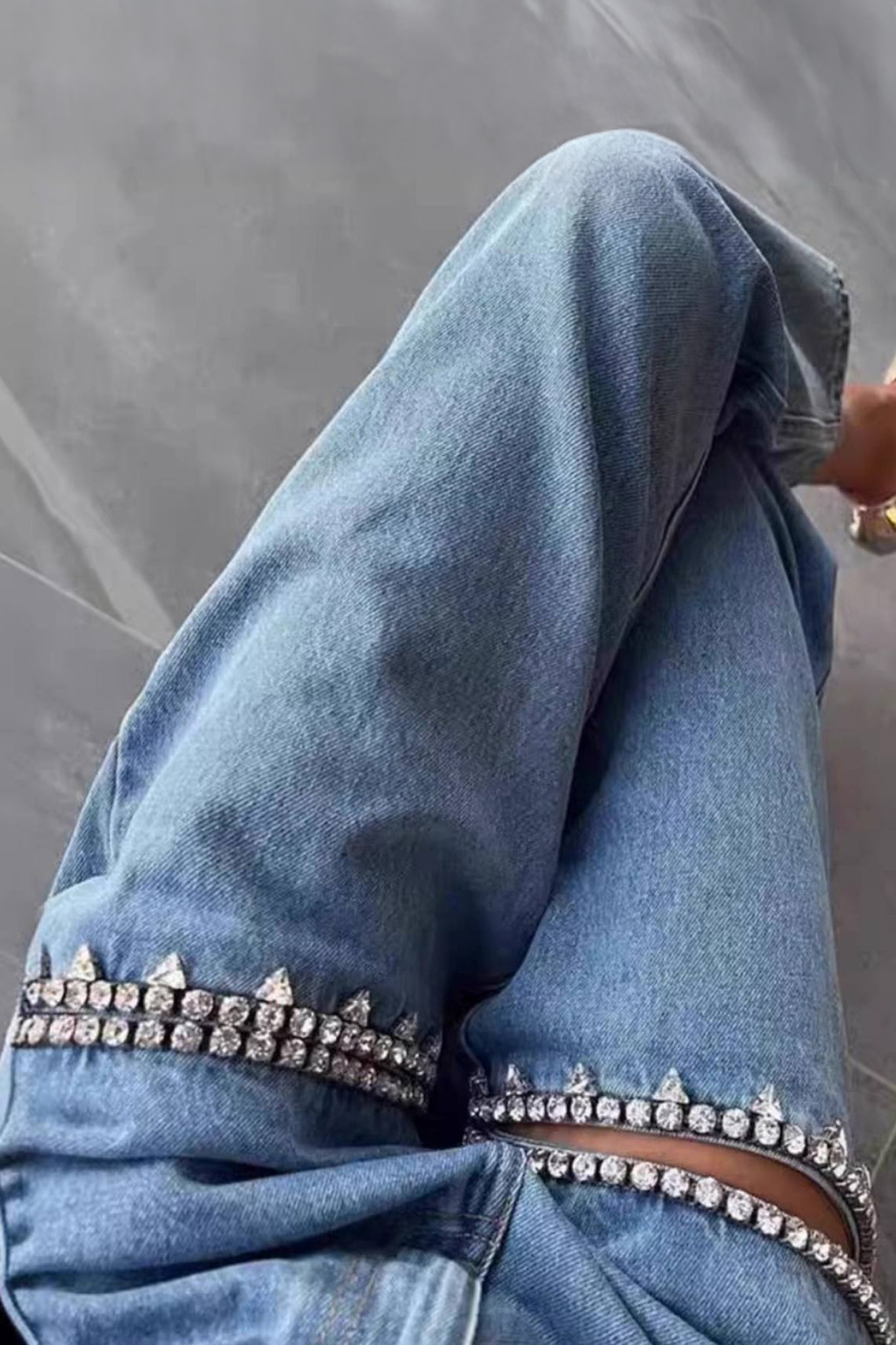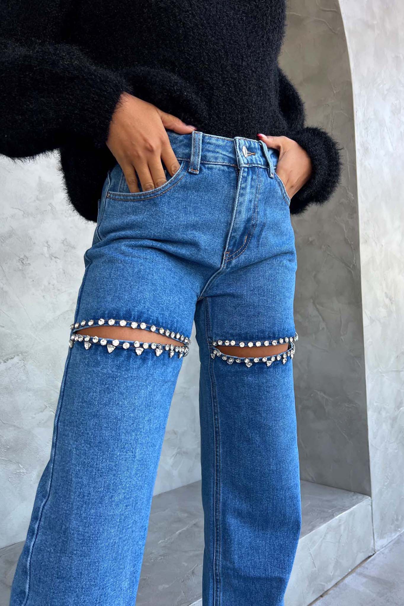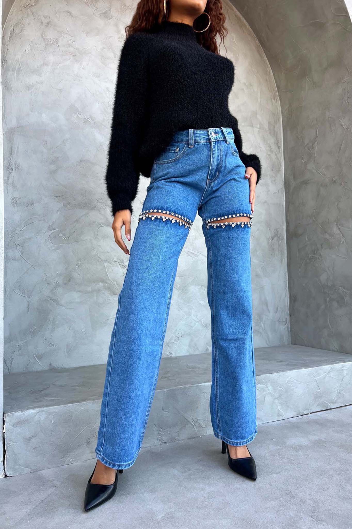Ψηλόμεσο τζιν παντελόνι με cut outs και λεπτομέρειες με strass. Μήκος 106cm Μέση 35cm