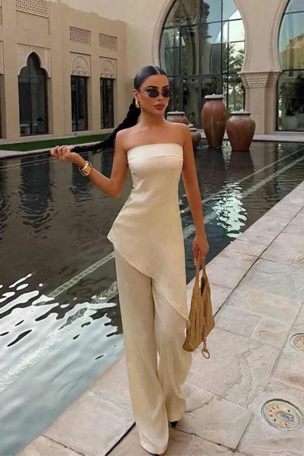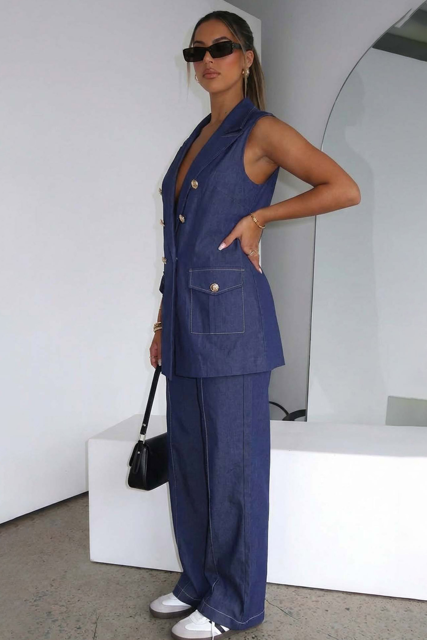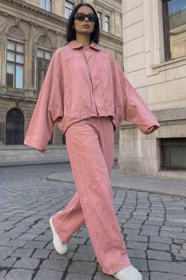 Σετ γιλέκο με παντελόνι με denim υφή. Ιδανικό για εμφανίσεις από το πρωί μέχρι το βράδυ!