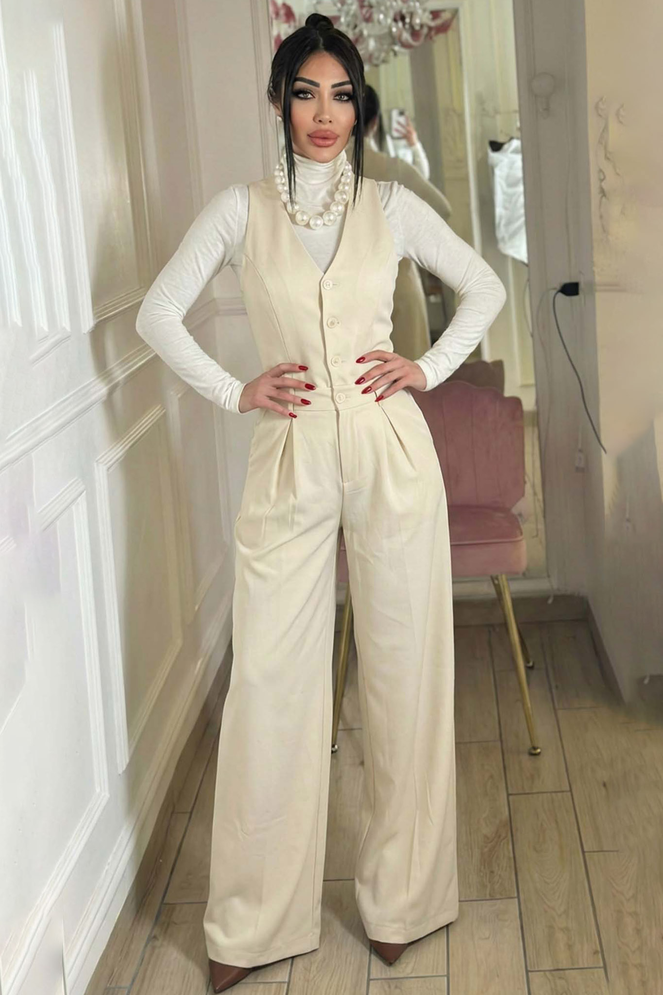 Ολόσωμη Φόρμα που συνδυάζει την αυστηρότητα ενός κοστουμιού με τη θηλυκότητα μιας μοντέρνας σιλουέτας. Σχεδιασμένη για τη γυναίκα που θέλει να ξεχωρίζει με το στυλ της από το πρωί έως το βράδυ.