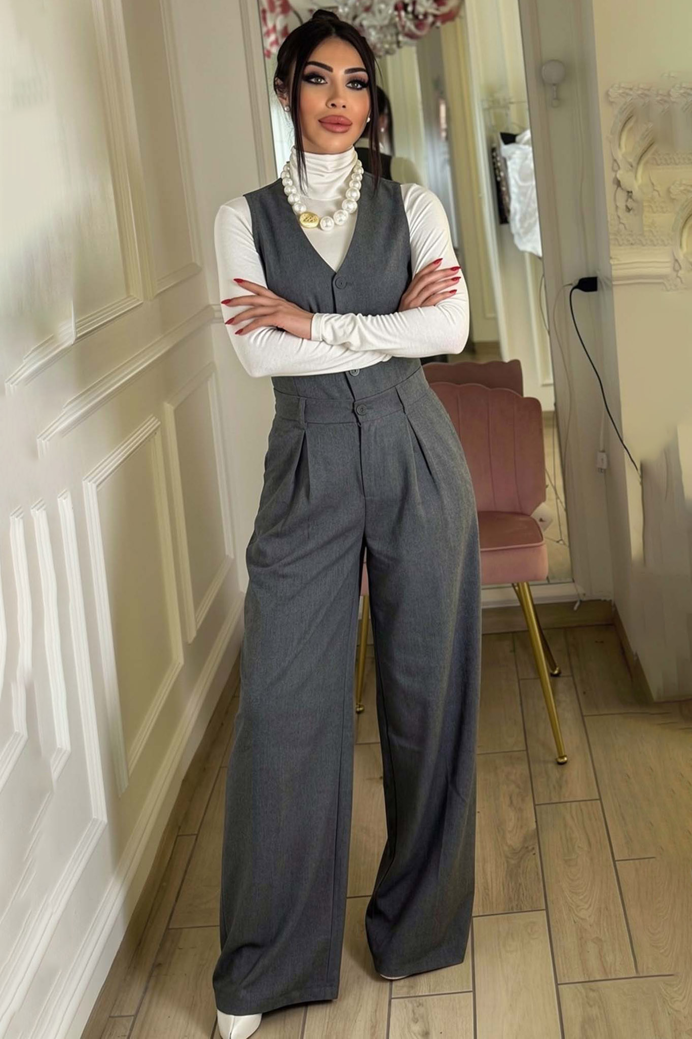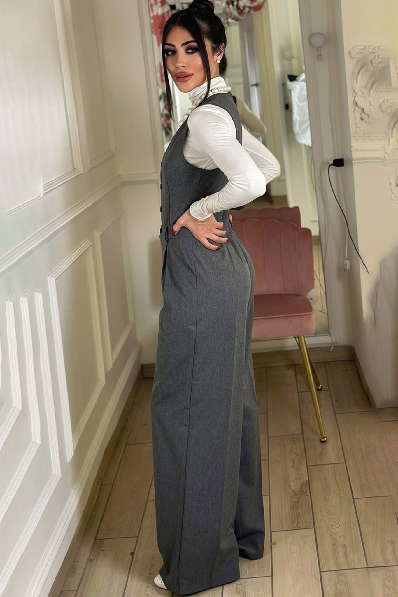 Ολόσωμη Φόρμα που συνδυάζει την αυστηρότητα ενός κοστουμιού με τη θηλυκότητα μιας μοντέρνας σιλουέτας. Σχεδιασμένη για τη γυναίκα που θέλει να ξεχωρίζει με το στυλ της από το πρωί έως το βράδυ.