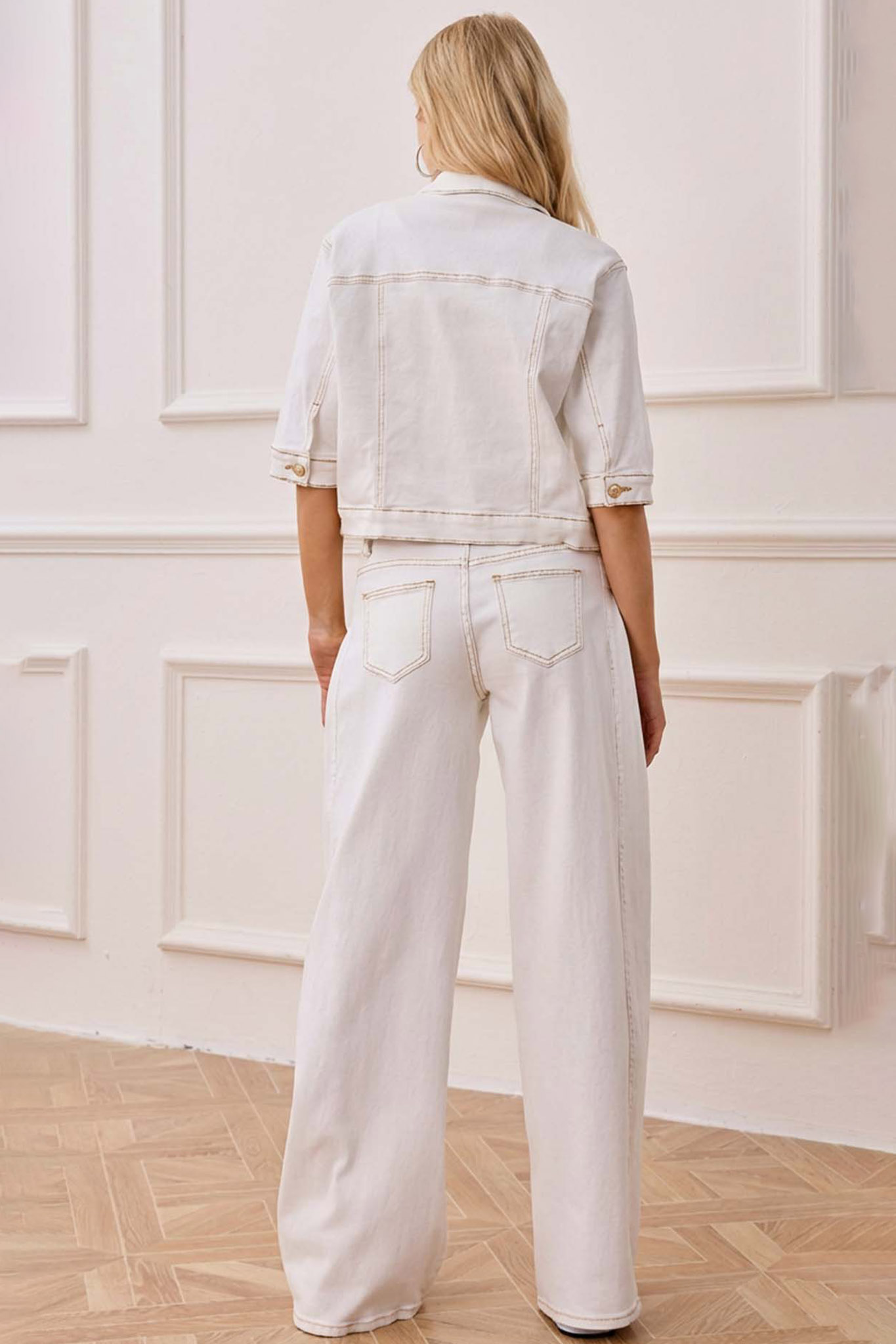 Σετ cropped τζιν τζάκετ με κοντά μανίκια, κλασικό γιακά και μεταλλικά κουμπιά. Διαθέτει τσέπες στο στήθος και προσφέρει ένα μοντέρνο, casual στυλ. Τζιν παντελόνι σε πολύ φαρδιά γραμμή με διακοσμητικές ραφές που ξεκινούν από τη μέση, δίνοντας όγκο και κίνηση.