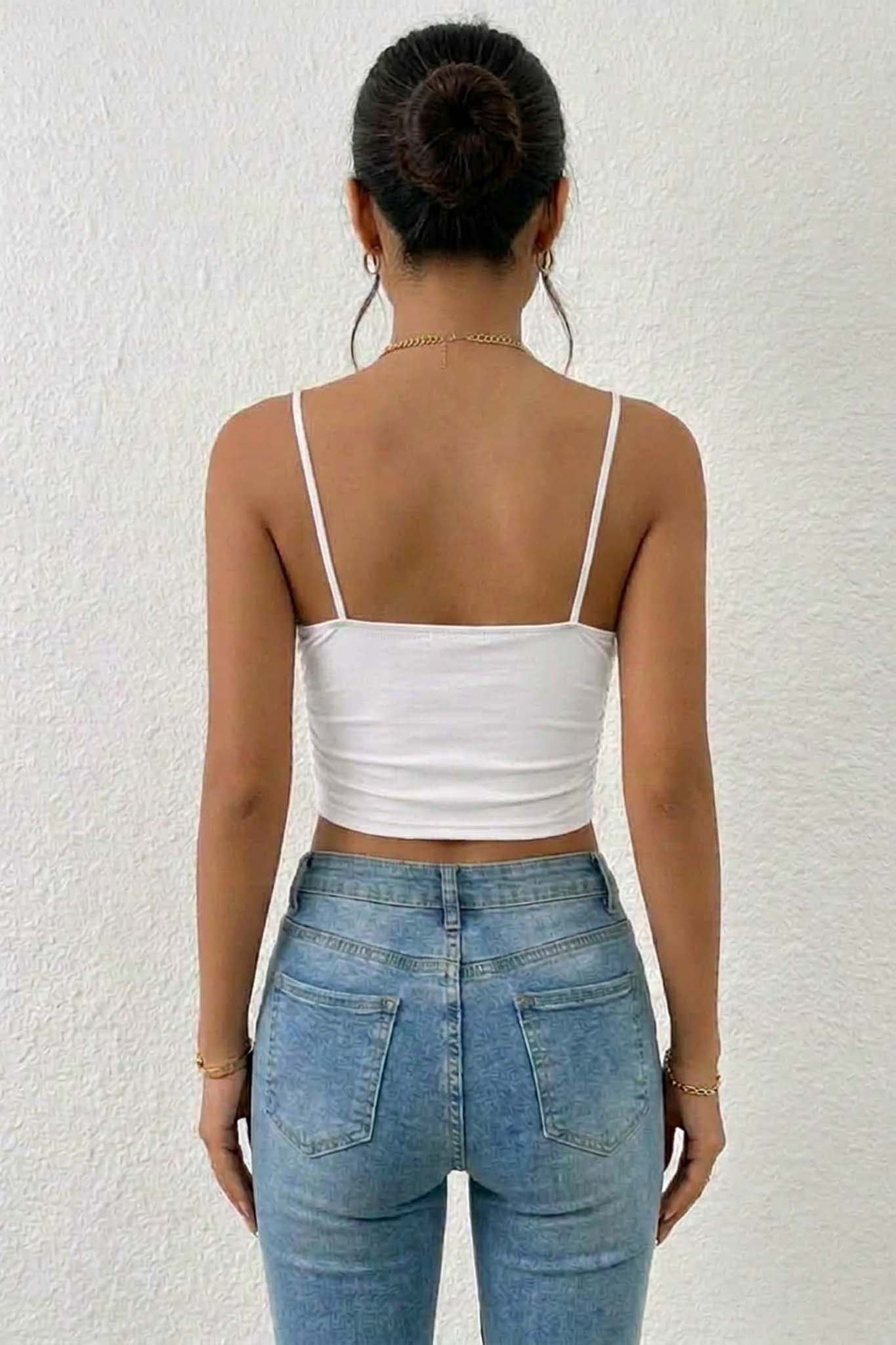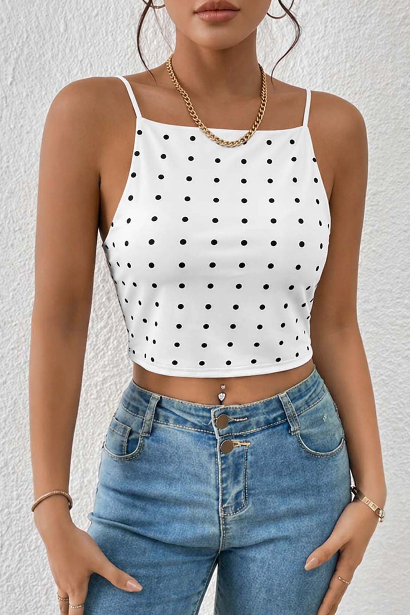Τοπ cropped με λεπτές τιράντες και πουά σχέδιο σε εφαρμοστή γραμμή. Ιδανικό για καθημερινά καλοκαιρινά looks και εύκολους συνδυασμούς με τζιν ή φούστες.