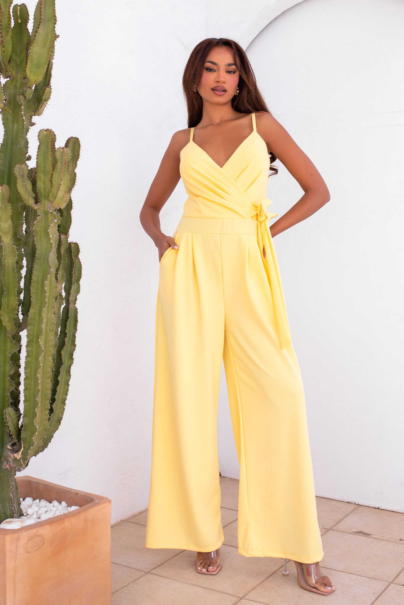 Ολόσωμη φόρμα σε αέρινη γραμμή, η οποία διαθέτει λεπτές τιράντες, κρουαζέ ντεκολτέ σε σχήμα V και ενσωματωμένη ζώνη που δένει στο πλάι, καταλήγοντας σε μια άνετη, φαρδιά παντελόνα.