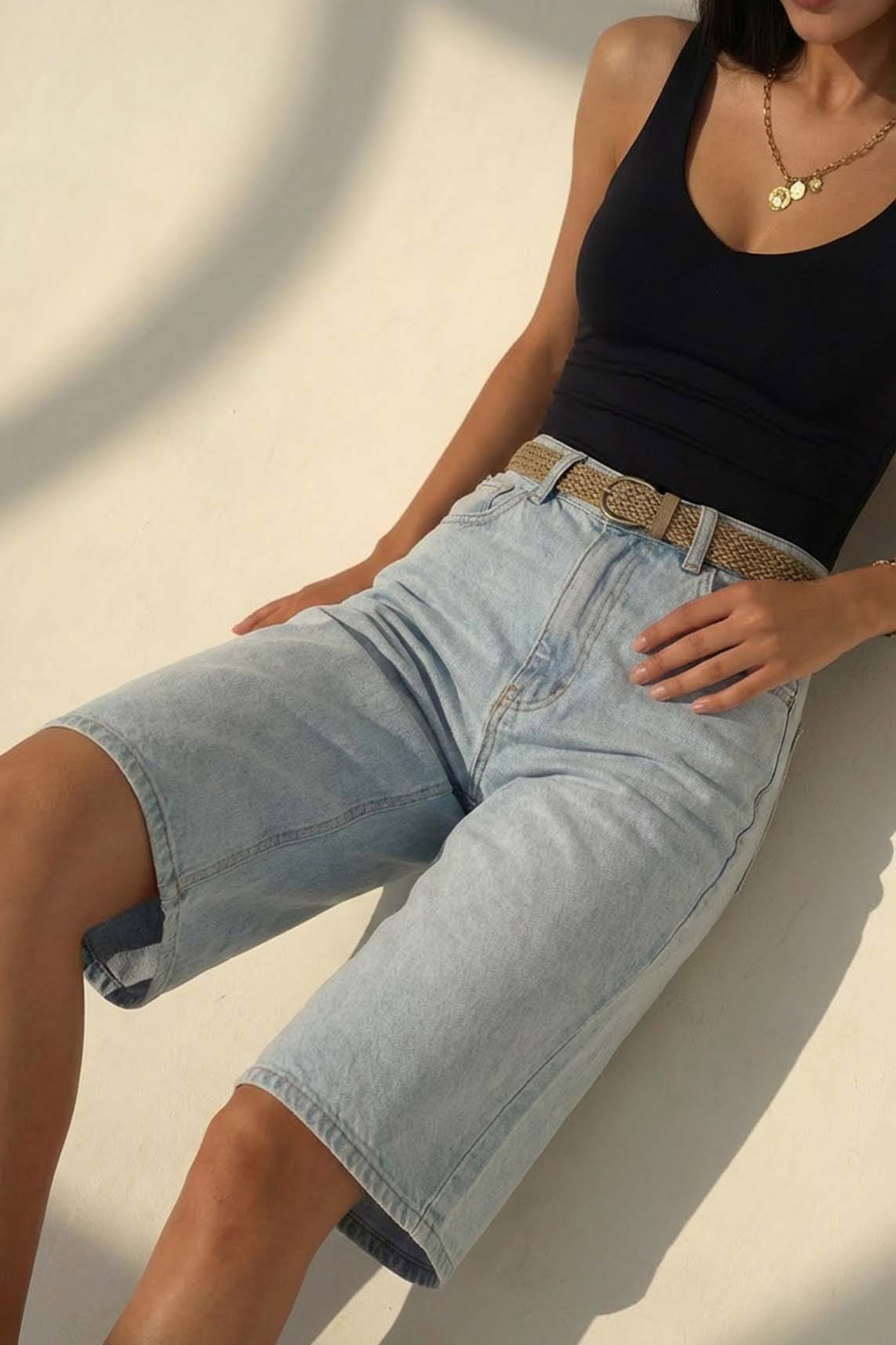Τζιν βερμούδα με ζωνάκι στη μέση σε άνετη μακριά ίσια γραμμή για να απογειώσει το στυλ σας.