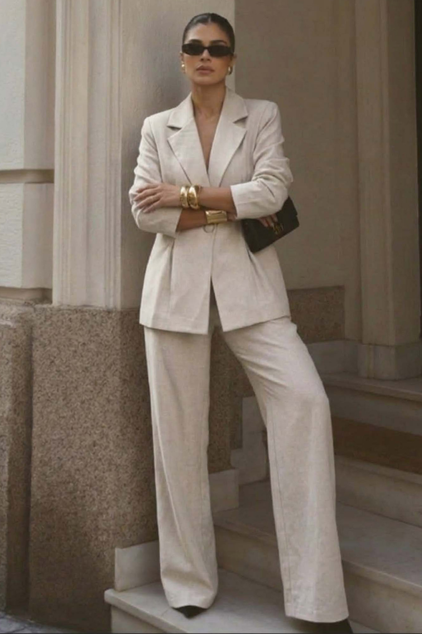 Σετ σακάκι- παντελόνι. Το μεσάτο blazer ξεχωρίζει για τη δομημένη του εφαρμογή με ενισχυμένους ώμους, κομψό πέτο και κλείσιμο με μονό κουμπί που σμιλεύει τη σιλουέτα, ενώ η ασορτί wide-leg παντελόνα προσφέρει άνεση και αέρινη κίνηση.