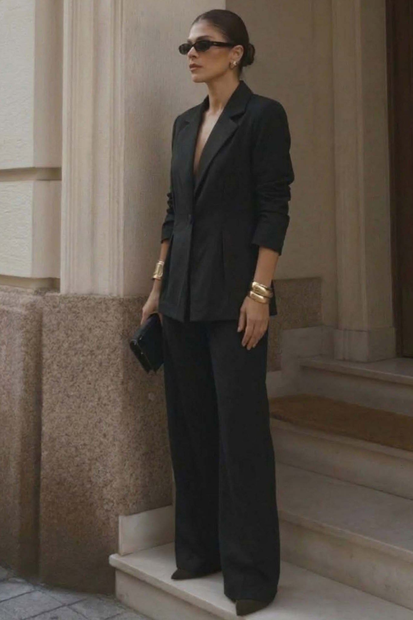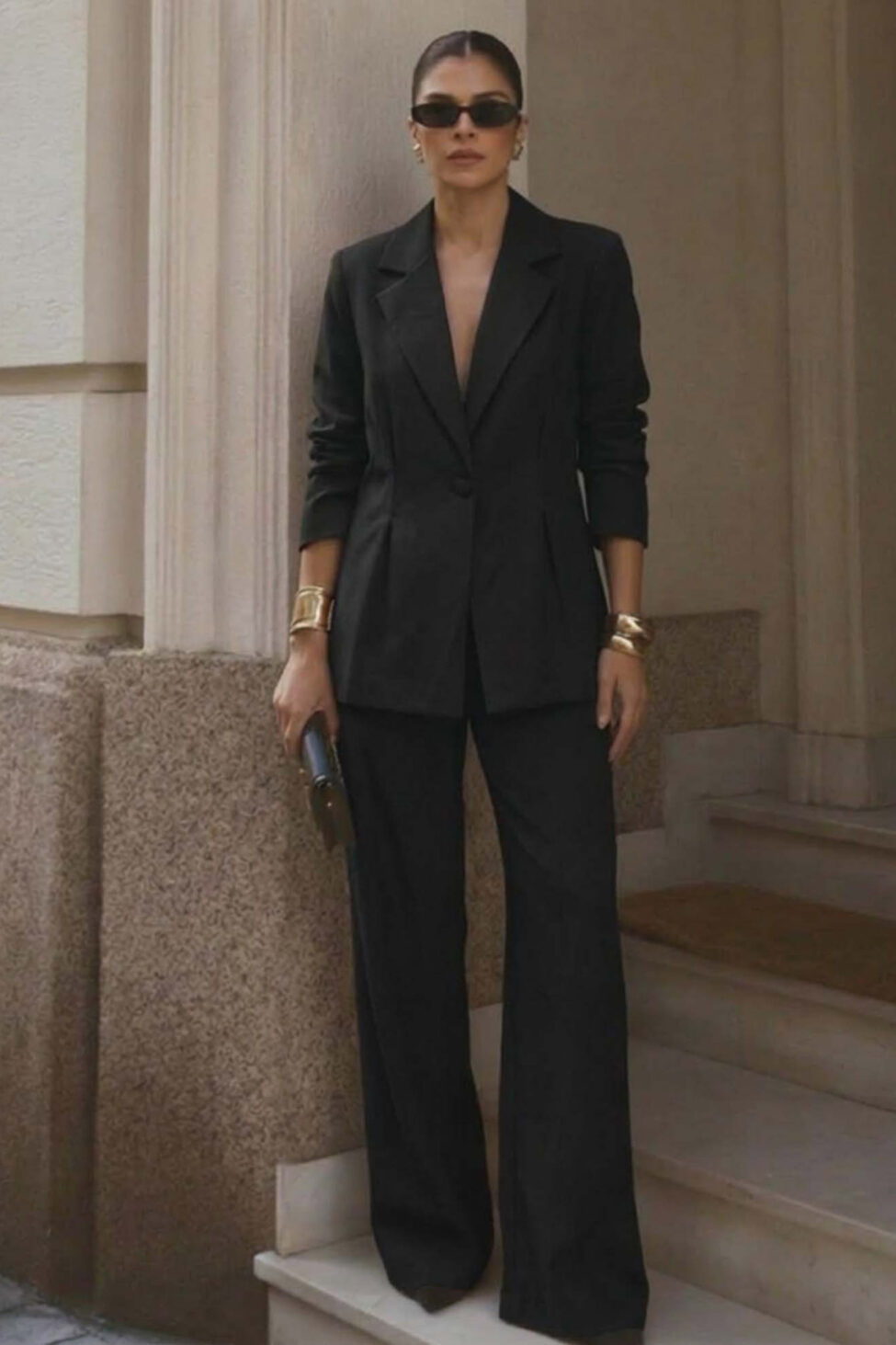 Σετ σακάκι- παντελόνι. Το μεσάτο blazer ξεχωρίζει για τη δομημένη του εφαρμογή με ενισχυμένους ώμους, κομψό πέτο και κλείσιμο με μονό κουμπί που σμιλεύει τη σιλουέτα, ενώ η ασορτί wide-leg παντελόνα προσφέρει άνεση και αέρινη κίνηση.