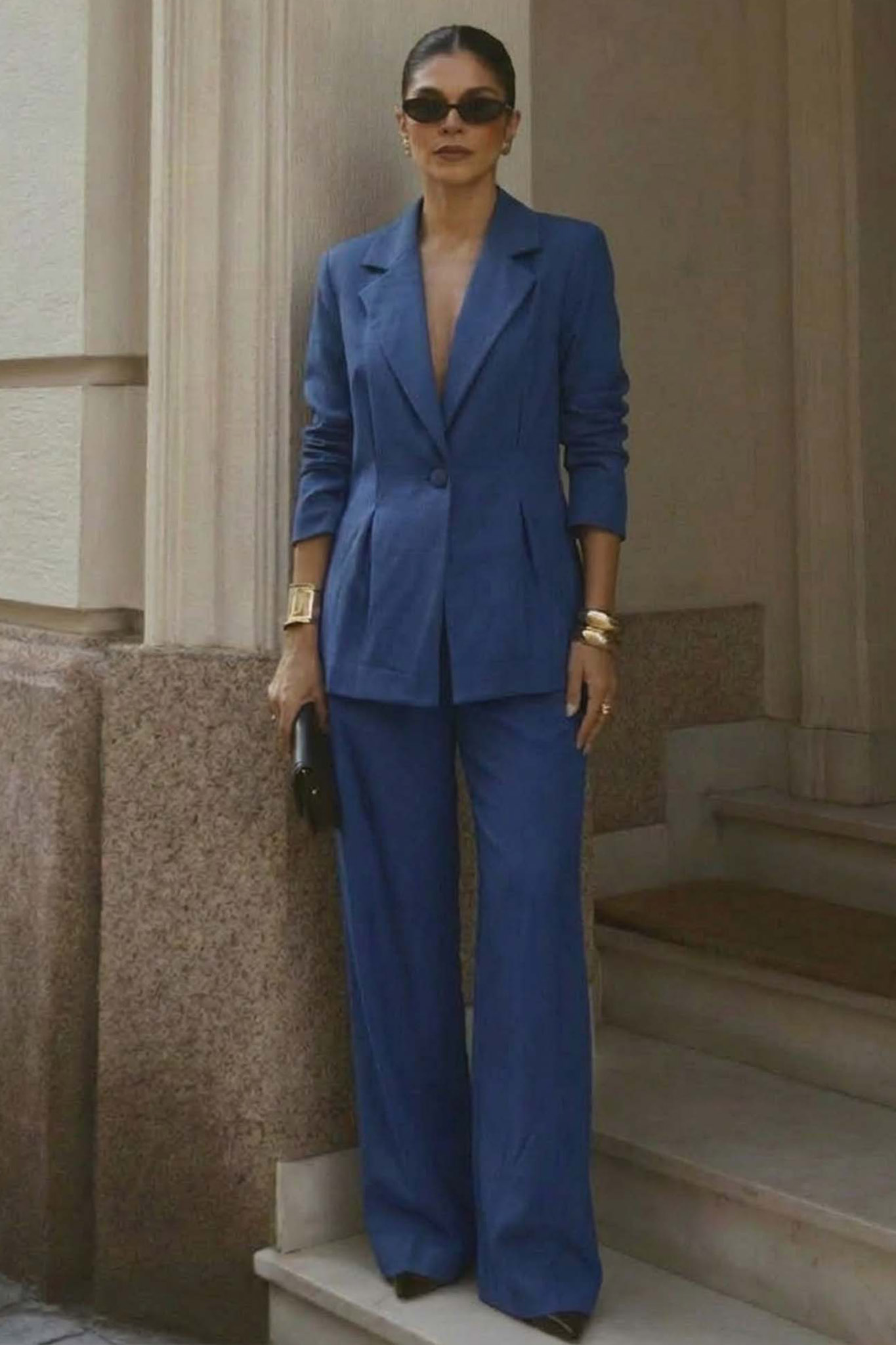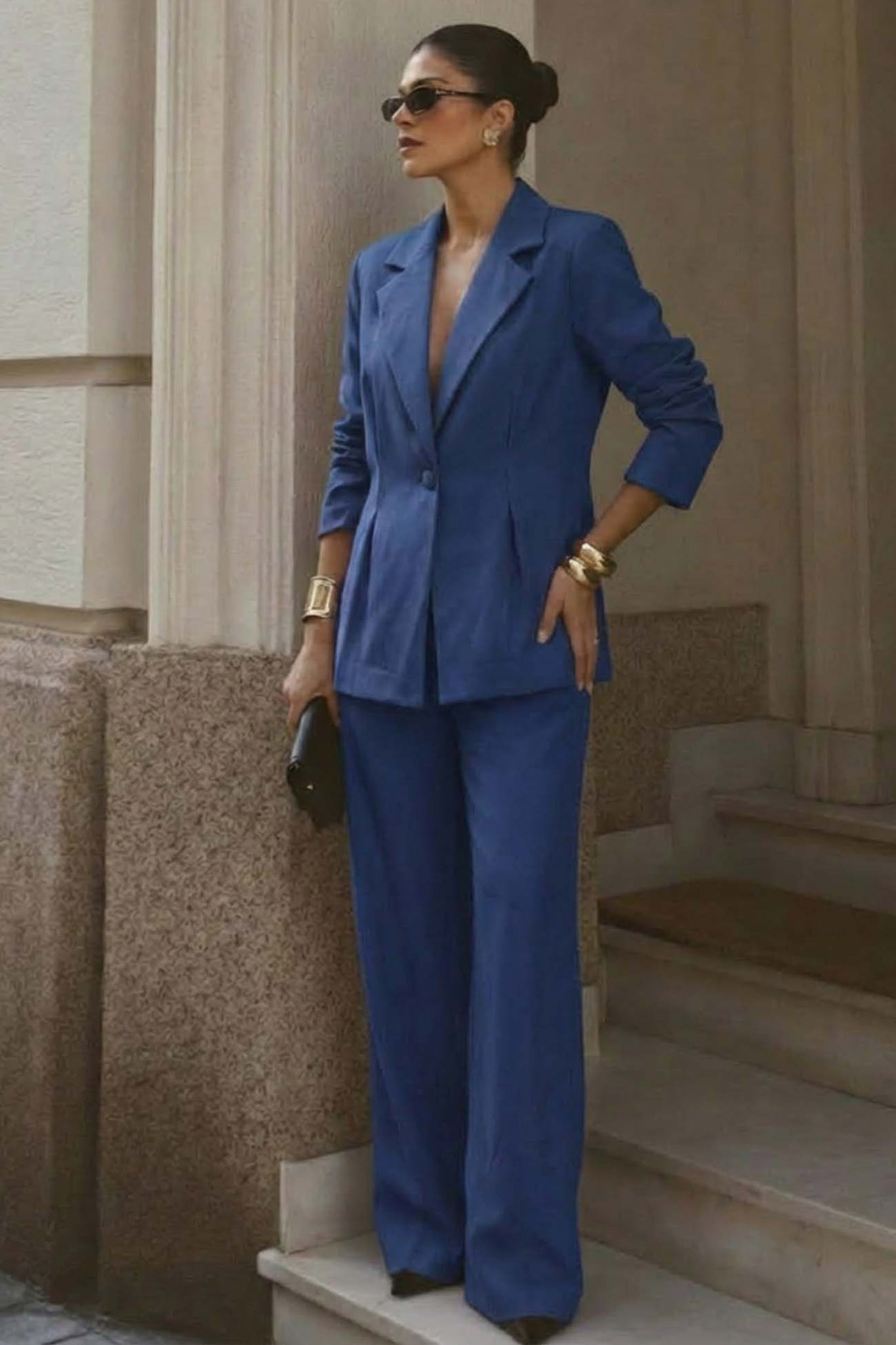 Σετ σακάκι- παντελόνι. Το μεσάτο blazer ξεχωρίζει για τη δομημένη του εφαρμογή με ενισχυμένους ώμους, κομψό πέτο και κλείσιμο με μονό κουμπί που σμιλεύει τη σιλουέτα, ενώ η ασορτί wide-leg παντελόνα προσφέρει άνεση και αέρινη κίνηση.