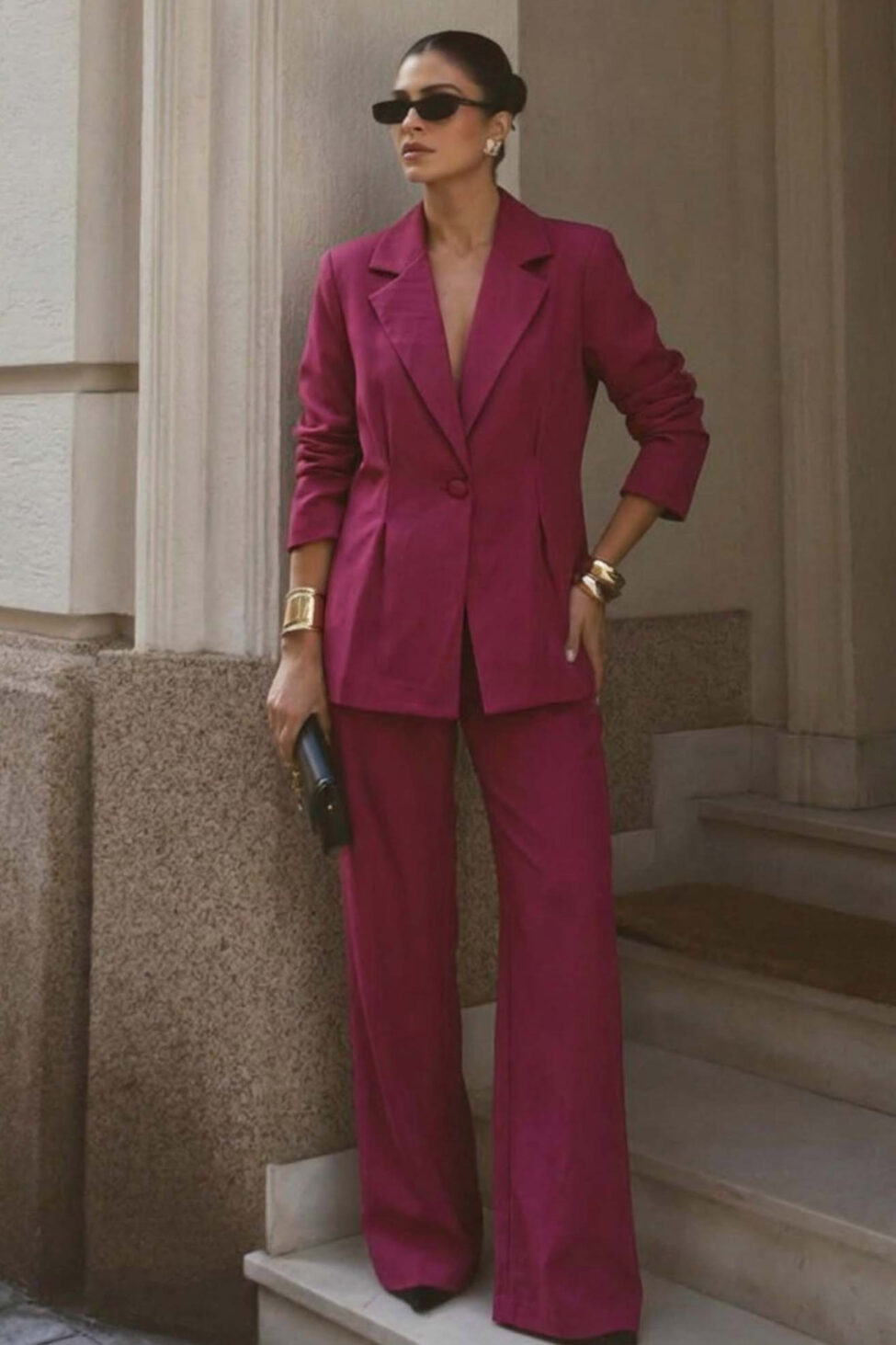 Σετ σακάκι- παντελόνι. Το μεσάτο blazer ξεχωρίζει για τη δομημένη του εφαρμογή με ενισχυμένους ώμους, κομψό πέτο και κλείσιμο με μονό κουμπί που σμιλεύει τη σιλουέτα, ενώ η ασορτί wide-leg παντελόνα προσφέρει άνεση και αέρινη κίνηση.