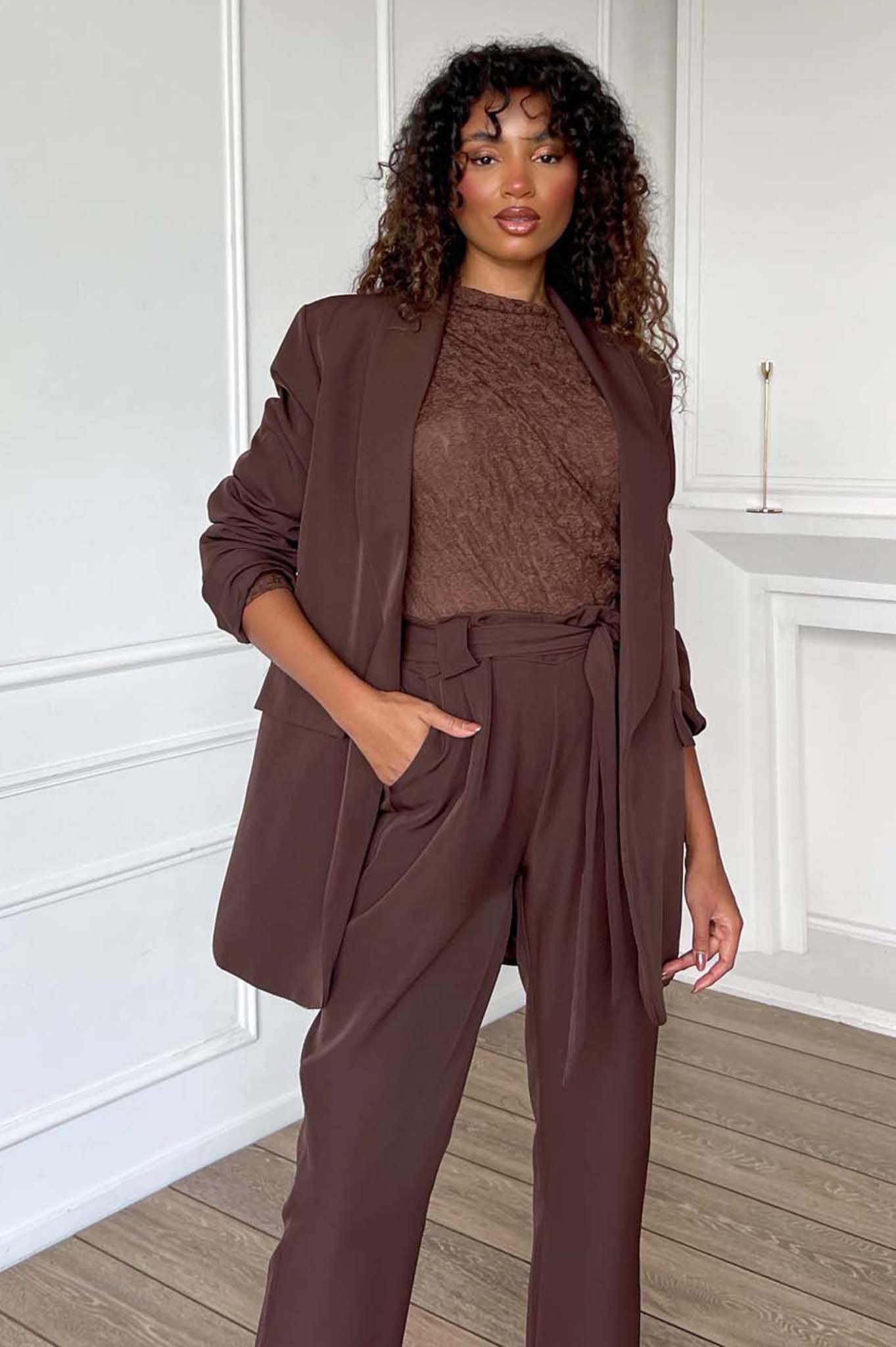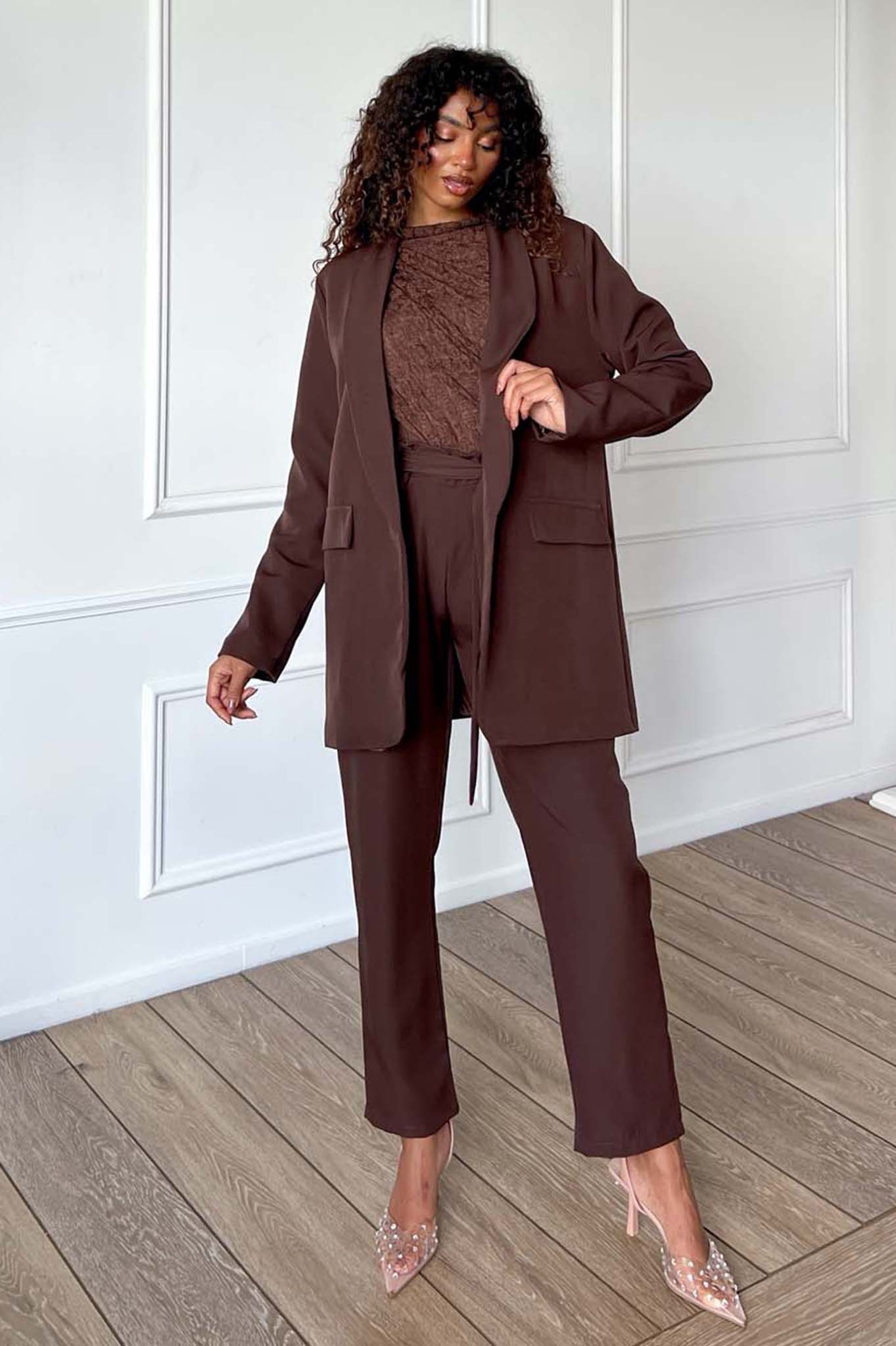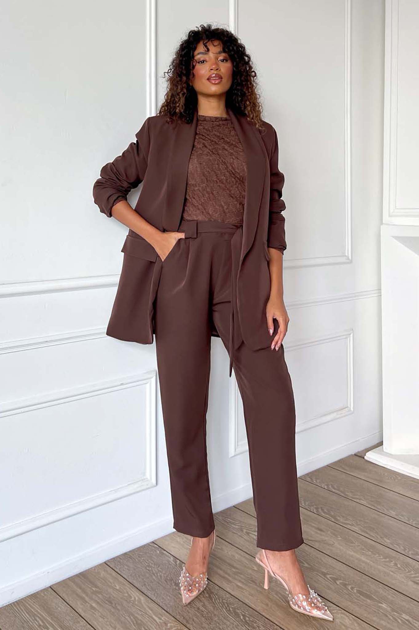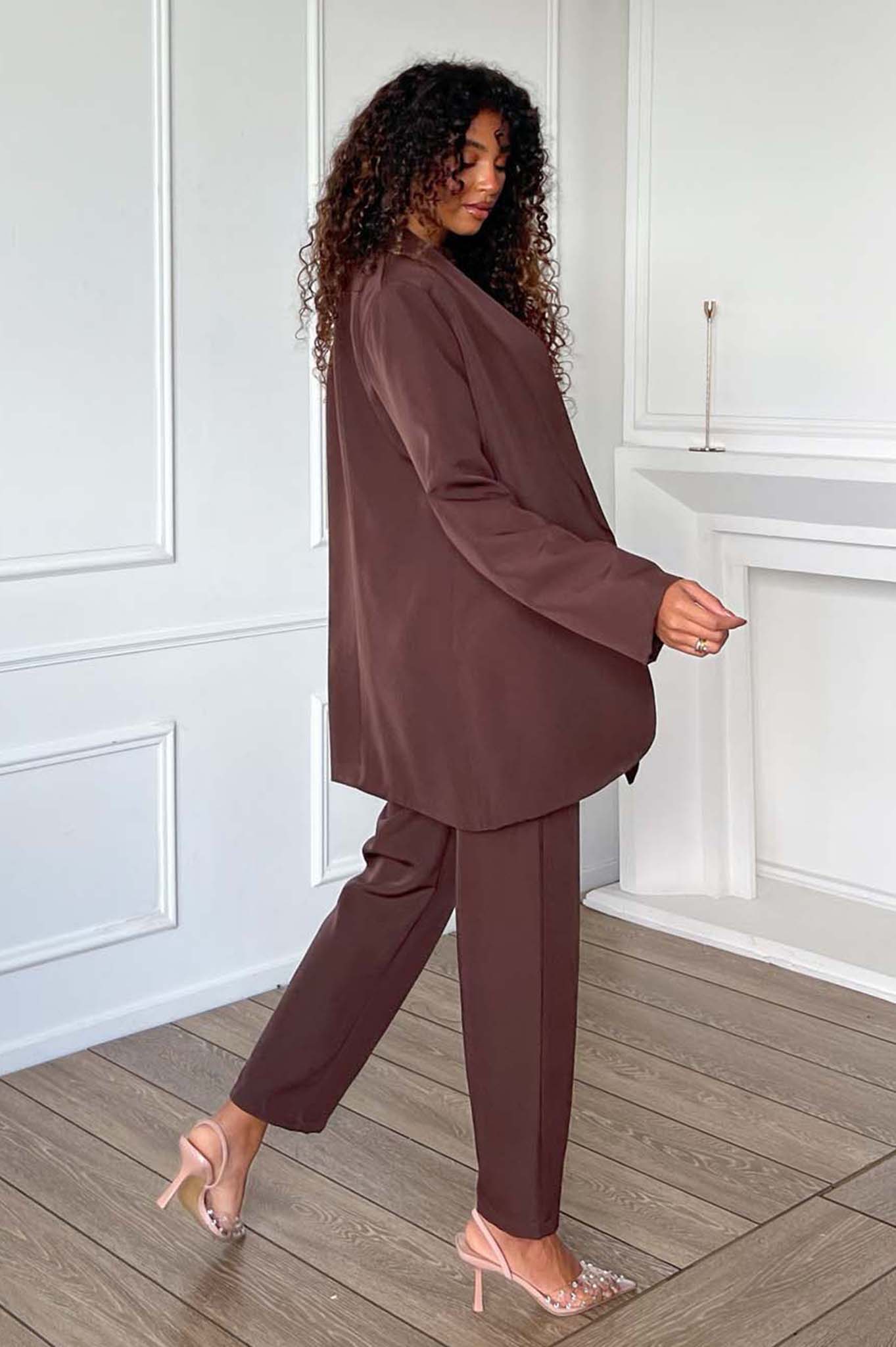 Σετ σακάκι παντελόνι. Το παντελόνι διαθέτει ζωνάκι και λάστιχο στο πίσω μέρος. Σακάκι: μήκος 77cm, στήθος 108cm, μανίκι 62cm. Παντελόνι μήκος 101cm, μέση 66cm.