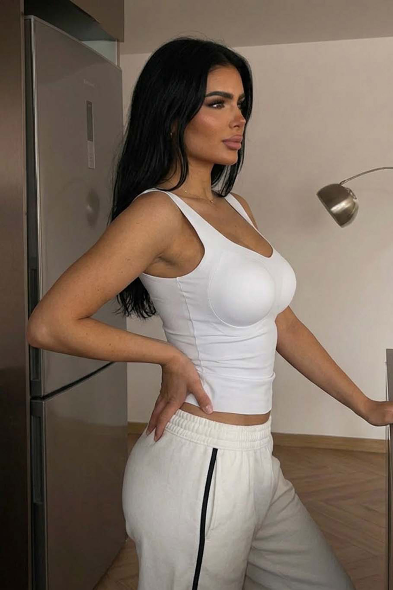 με ενσωματωμένη ενίσχυση στο στήθος, σχεδιασμένο να προσφέρει υποστήριξη και σμίλευση της σιλουέτας χωρίς την ανάγκη για επιπλέον εσώρουχο. Είναι κατασκευασμένο από ελαστικό, seamless ύφασμα που αγκαλιάζει το σώμα, διαθέτει φαρδιές τιράντες και ανοιχτή λαιμόκοψη, συνδυάζοντας την άνεση ενός αθλητικού μπουστακίου με την κομψότητα ενός casual top.