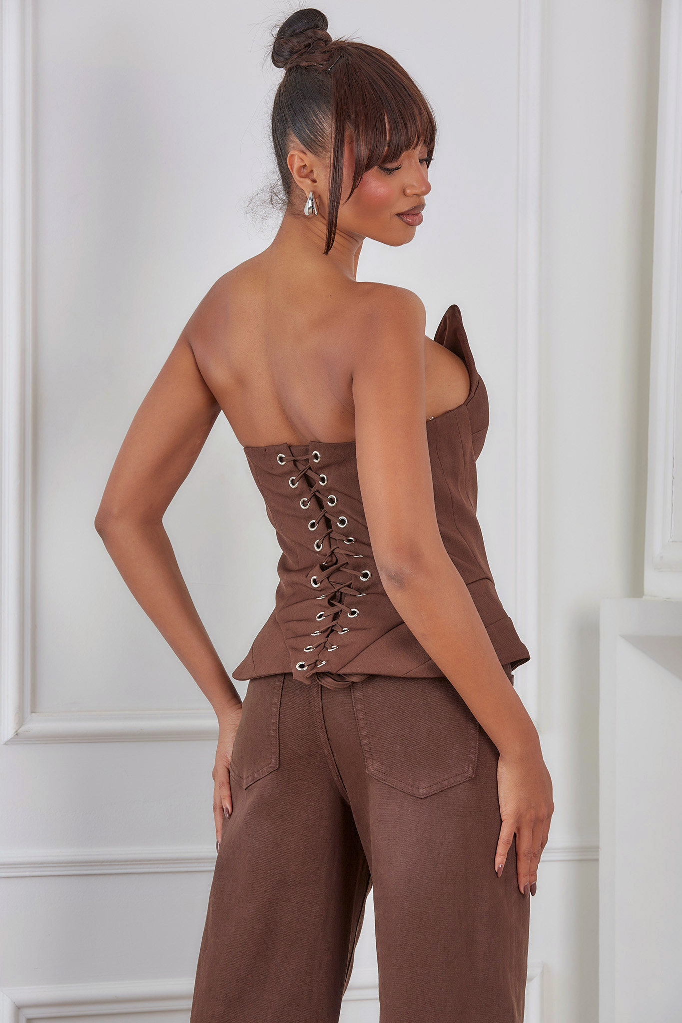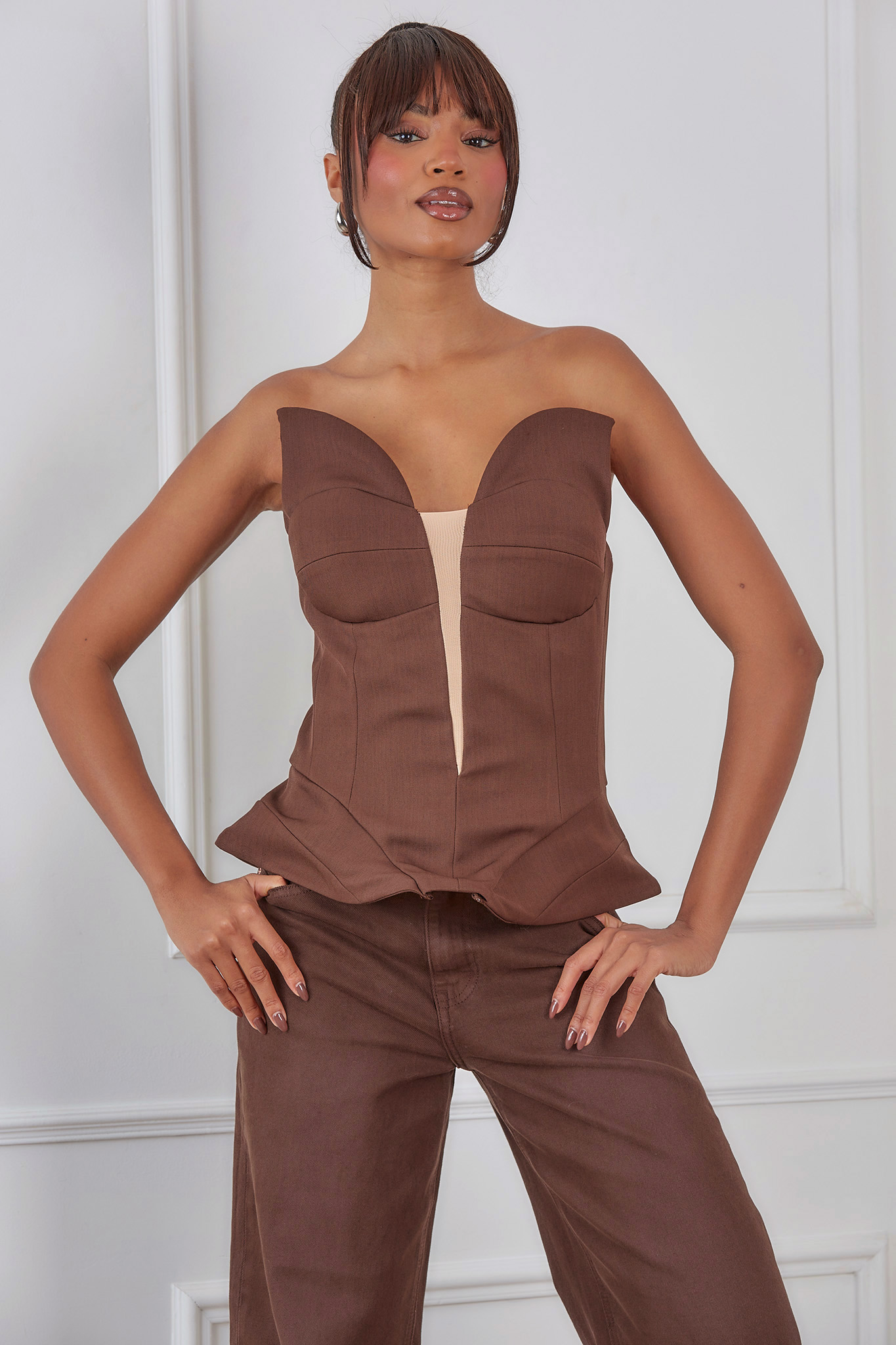 Κορσέ-τοπ με ενισχυμένα cups και εφαρμοστή γραμμή, σχεδιασμένος να αναδεικνύει τη θηλυκή σιλουέτα. Κατασκευασμένος από ποιοτικό ύφασμα με διακριτική υφή, διαθέτει ραφές που προσφέρουν στήριξη και κομψότητα. Ιδανικός για βραδινές εμφανίσεις ή ιδιαίτερες περιστάσεις, συνδυάζεται εύκολα με φούστες ή παντελόνια για ένα εντυπωσιακό και στυλάτο look. Διατίθεται σε κλασικό μαύρο και ζεστό καφέ χρώμα.