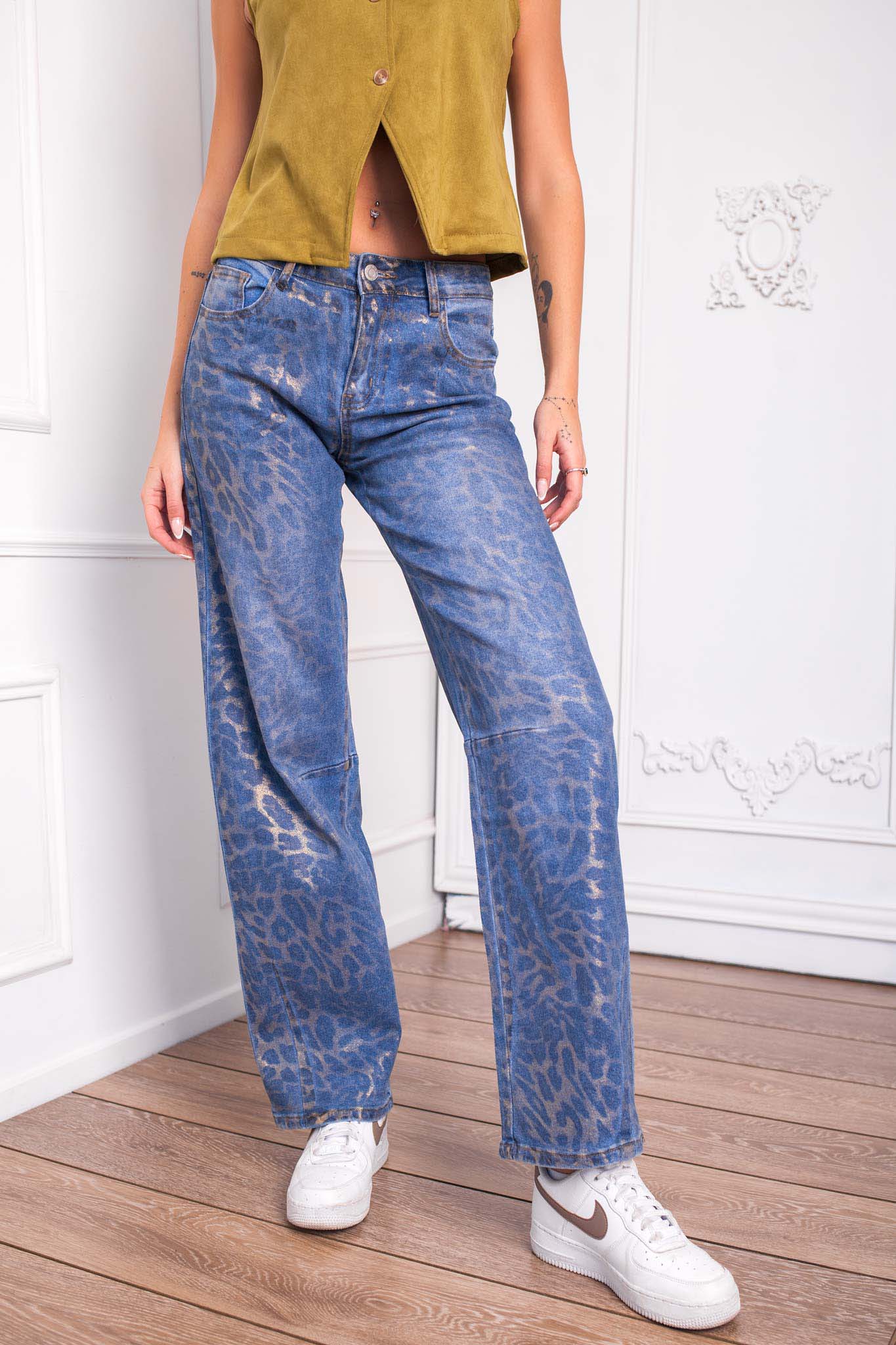 Glam τζιν παντελόνι με holographic λεοπάρ print. ’νετη εφαρμογή. Μέτρηση για small: Μήκος 103cm, Mέση 70cm