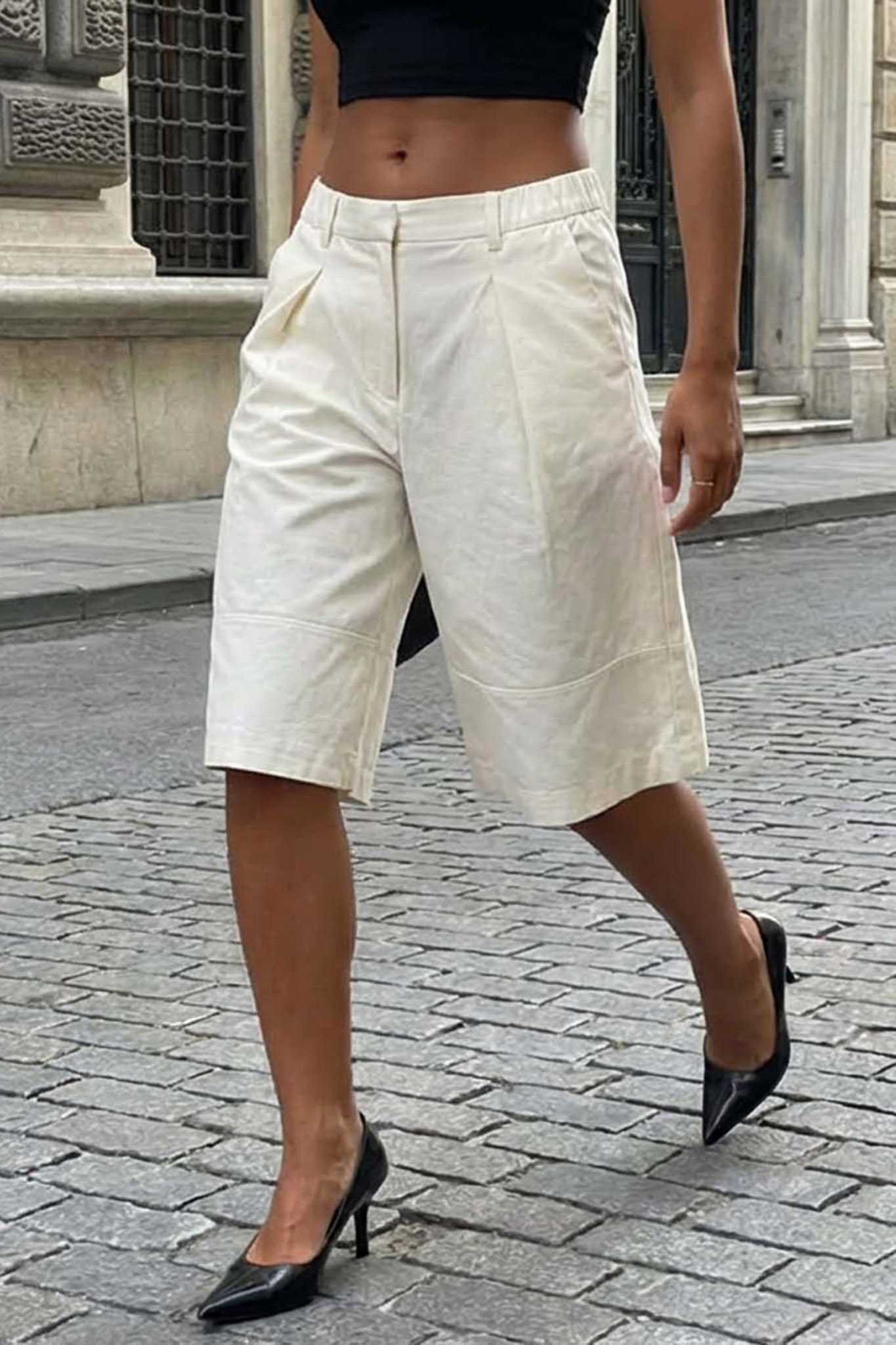 Υφασμάτινη βερμούδα αποτελεί την επιτομή του “office chic” στυλ σε μια πιο καλοκαιρινή εκδοχή. Η ψηλόμεση γραμμή της, σε συνδυασμό με τις κομψές πιέτες στο μπροστινό μέρος, χαρίζει μια δομημένη και σοφιστικέ όψη.